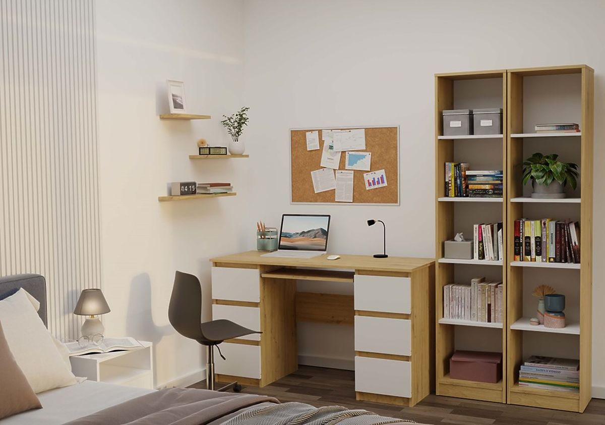 Raftul R40 combină stejarul artisan cu rafturi albe contrastante. .. mai mult