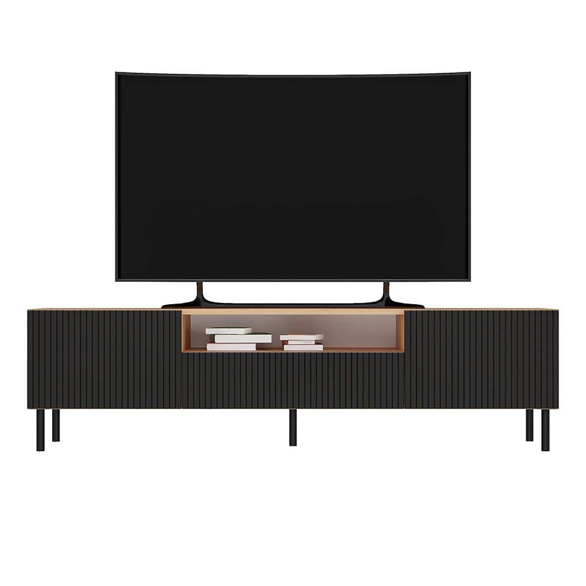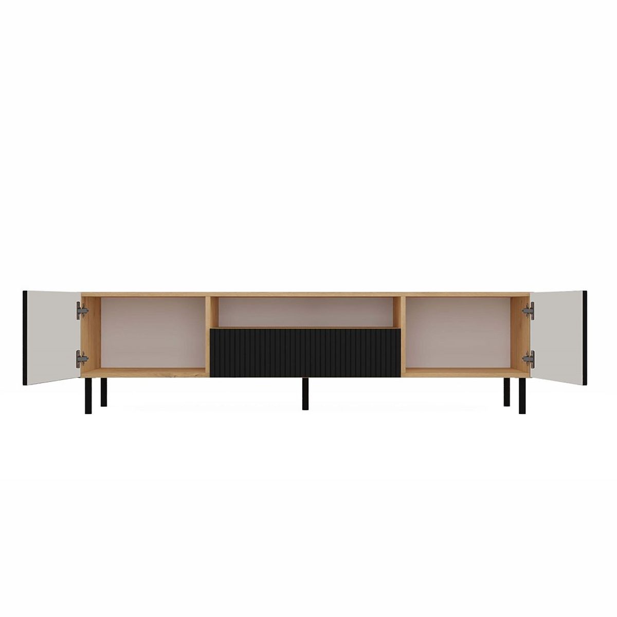 Un mare avantaj sunt picioarele metalice rotunde de 13 cm înălțime, care adaugă lejeritate vizuală întregii construcții și asigură stabilitatea mobilierului TV.