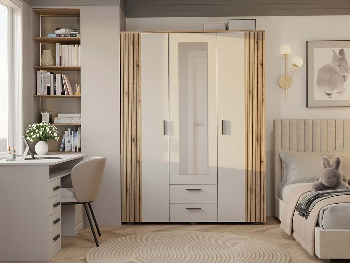 - Formă modernă cu trei uși și oglindă centrală – ideală pentru amenajări în stil modern, scandinav și boho