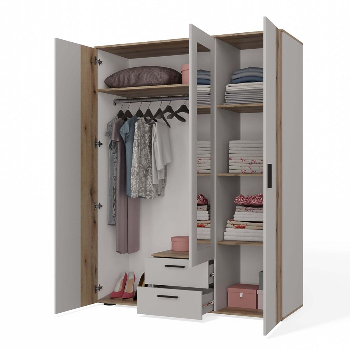 Alegeți dulapul AVA 150 dacă căutați o combinație de stil modern cu funcționalitate ridicată și o organizare interioară bine gândită. Este un mobilier creat pentru utilizatorii care apreciază estetica și ordinea – atât în dormitor, dressing, cât și în hol.