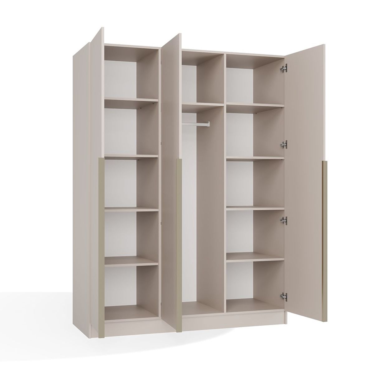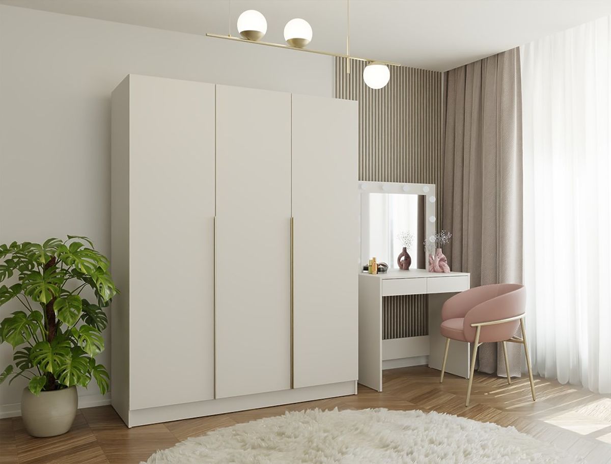 Dacă căutați o combinație de minimalism, eleganță și funcționalitate excepțională, dulapul SENSO 3D este alegerea perfectă. Acest dulap cu trei uși impresionează prin forma sa simplă, finisajul mat în culoarea cașmirului și mânerele aurii caracteristice în nuanța aurului periat, care subliniază caracterul său luxos.