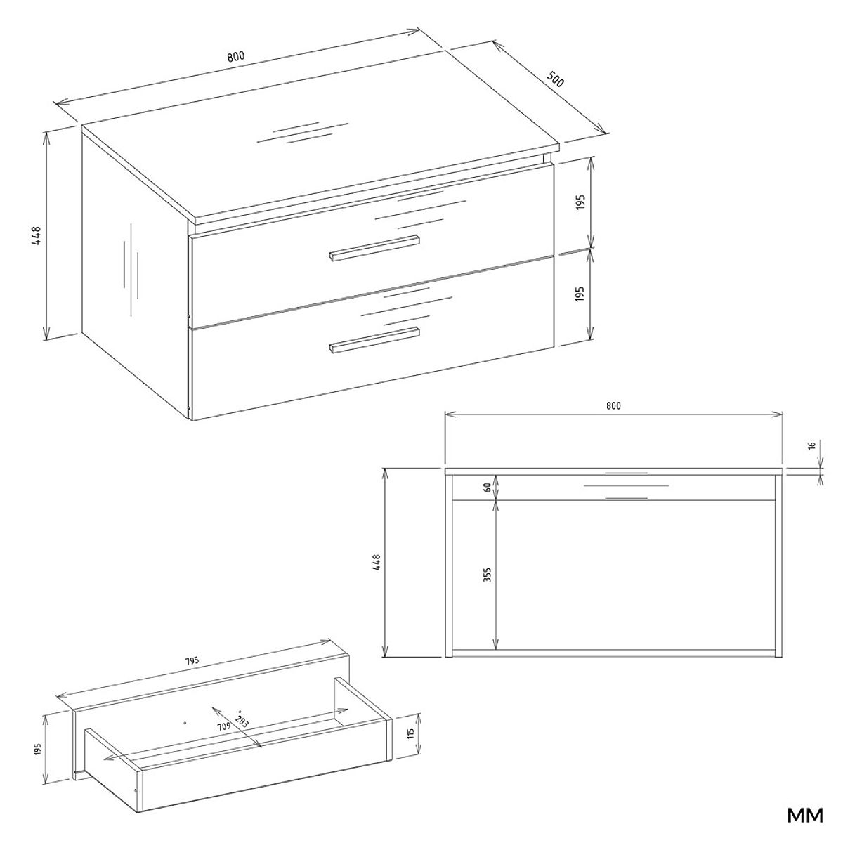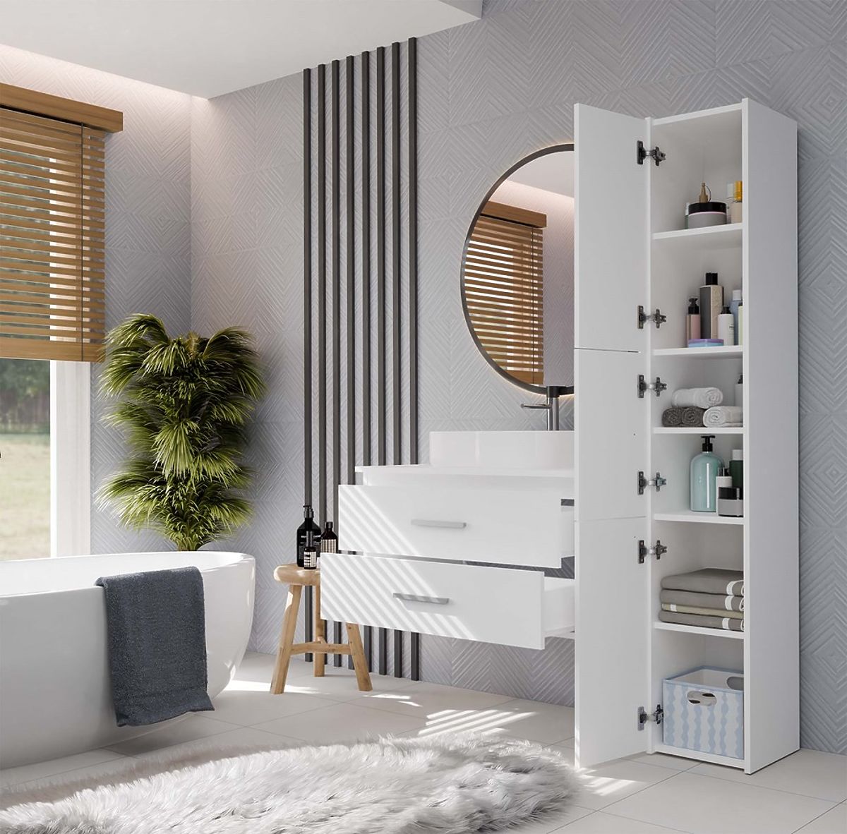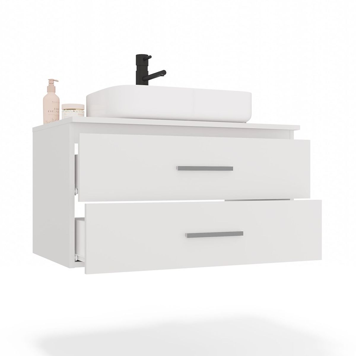 Mobilierul este echipat cu două sertare spațioase, ideale pentru depozitarea cosmeticelor, prosoapelor sau altor accesorii de baie. Ambele sertare au adâncime completă – nu au decupaje pentru sifon. Utilizarea unui sifon de perete permite utilizarea completă a spațiului acestora.