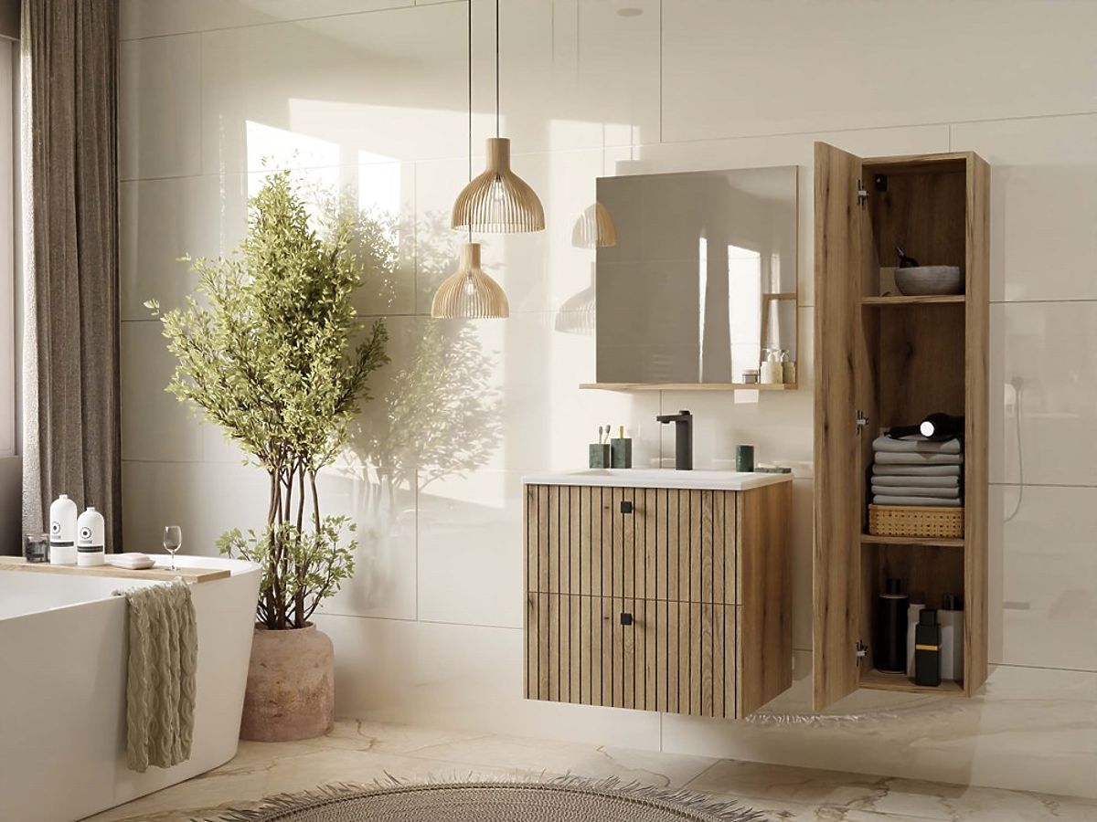 Dulap de baie suspendat TIGO 60 2S cu lavoar suprapus și panou frontal canelat. .. mai mult