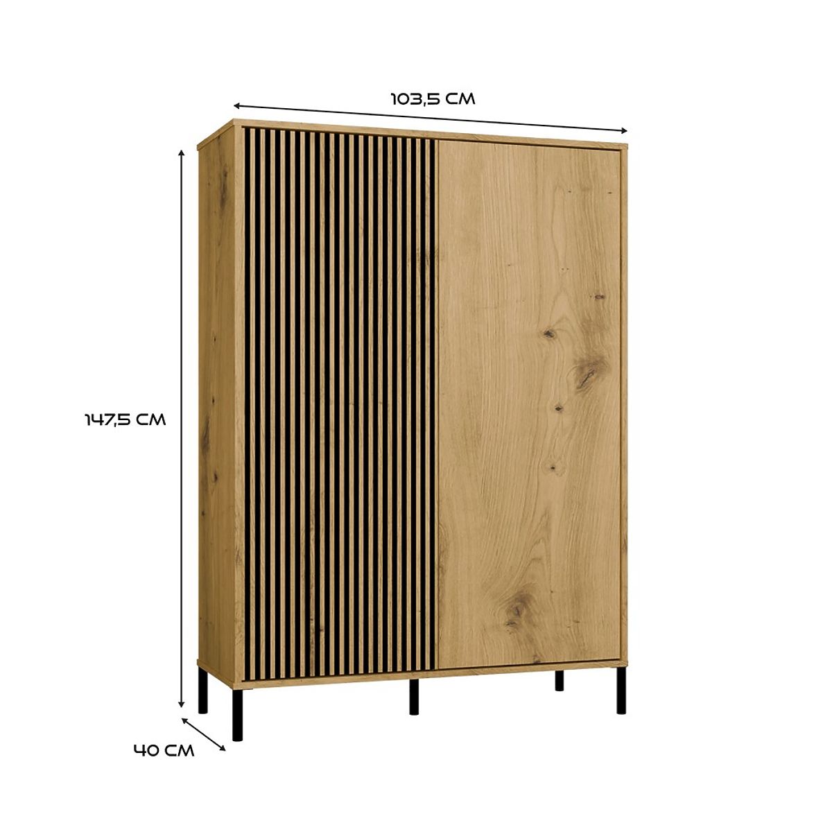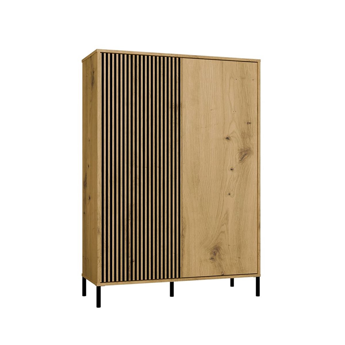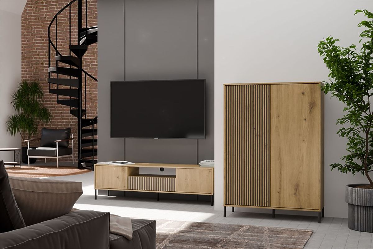 CULOARE:Vitrina KAMARO 2DD SLIM/STEJAR ARTISAN este o combinație de estetică și funcționalitate, ideală pentru living, camera de oaspeți, dormitor sau birou. Combinația de uși cu fațadă netedă și uși cu fațadă canelată, amintind de lamele, adaugă caracter, în timp ce sistemul TIP-ON permite utilizarea comodă fără mânere. Mobilierul oferă spațiu de depozitare generos și este un element stilat în interioarele moderne.