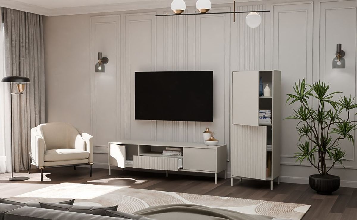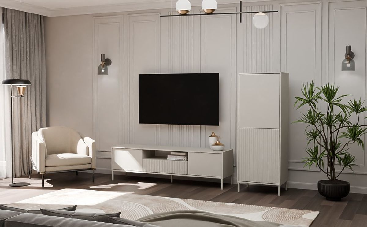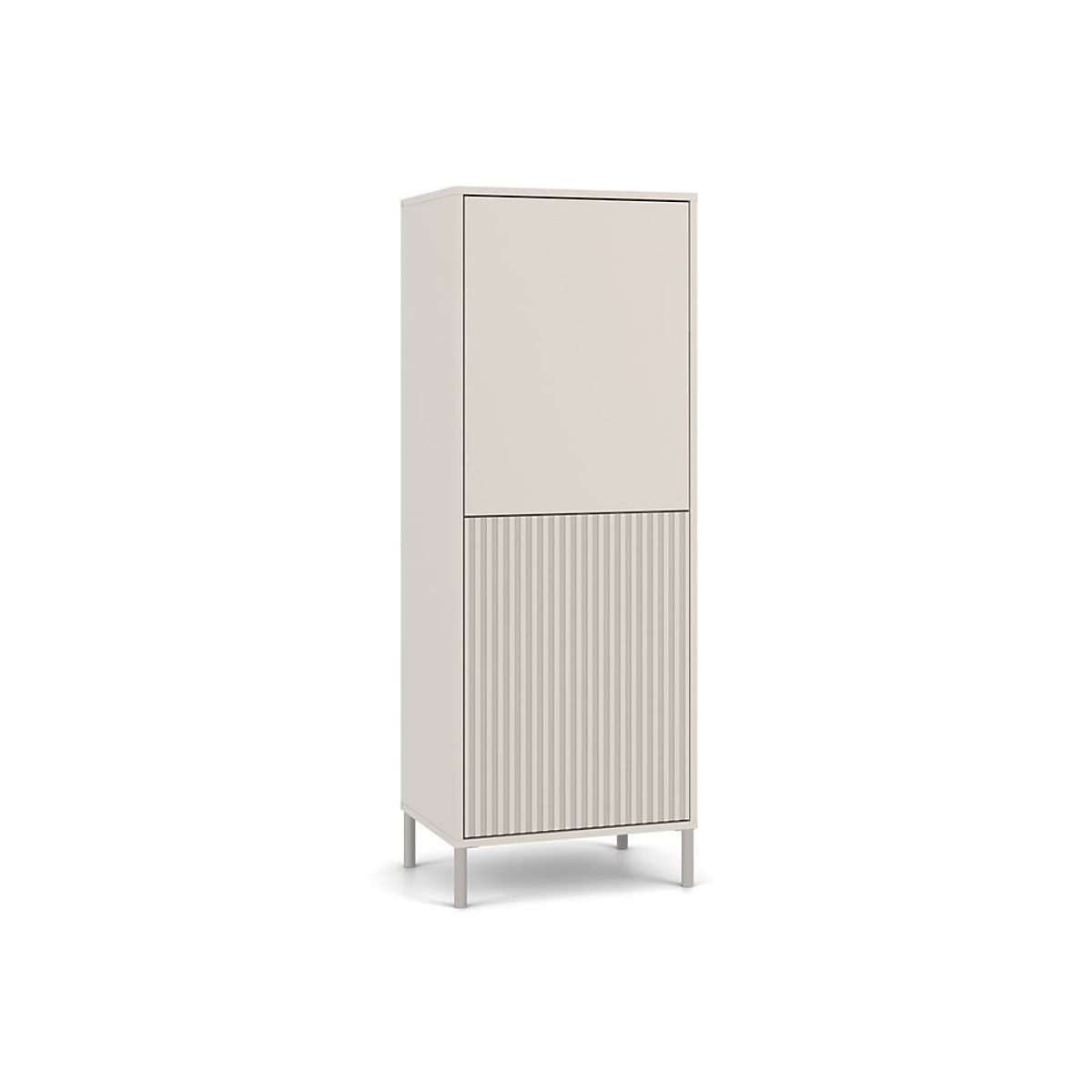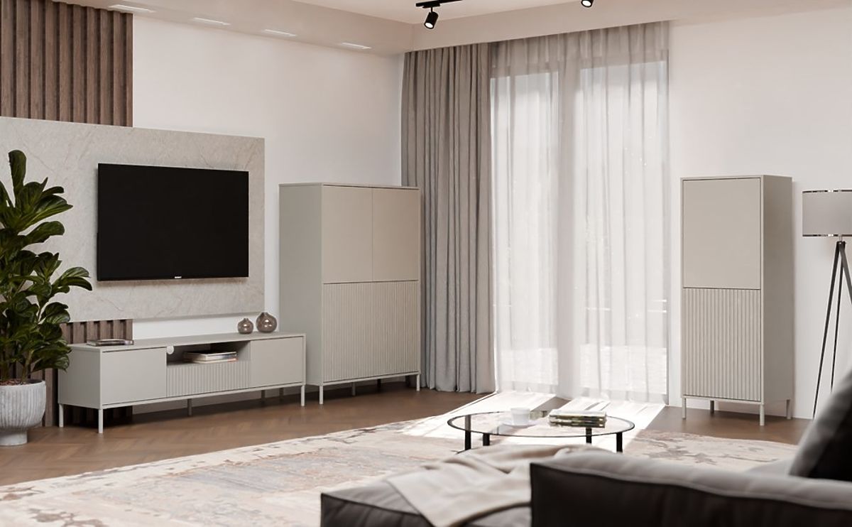 ELEGANȚĂ ȘI PRACTICITATE ÎNTR-UNULVitrina KAMARO 2DK SLIM/SMOOTH CAȘMIR este o combinație de estetică și funcționalitate, care se potrivește perfect în living, camera de oaspeți, dormitor sau birou. Combinația de uși cu panou frontal neted și uși cu panou frontal canelat, asemănător lamelor, adaugă caracter, iar sistemul TIP-ON permite utilizarea confortabilă fără mânere. Mobilierul oferă suficient spațiu de depozitare și este, de asemenea, un element stilat într-un interior modern.