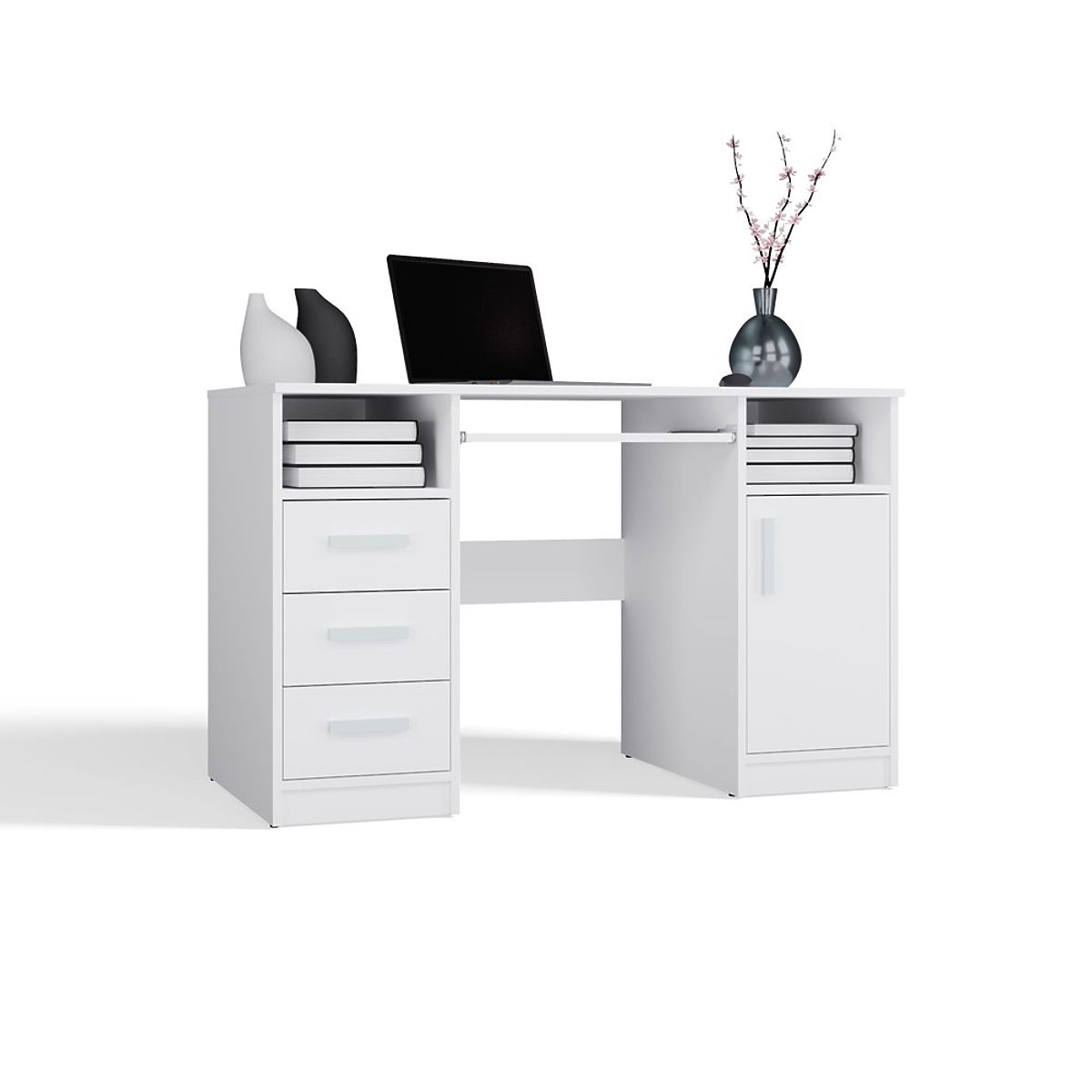 Echipat cu 3 sertare și un dulap închis cu 1 ușă și 2 rafturi, oferă suficient spațiu de depozitare pentru documente, cărți sau rechizite de birou. În plus, sub blat este disponibil un raft extensibil pentru tastatură, facilitând utilizarea computerului.