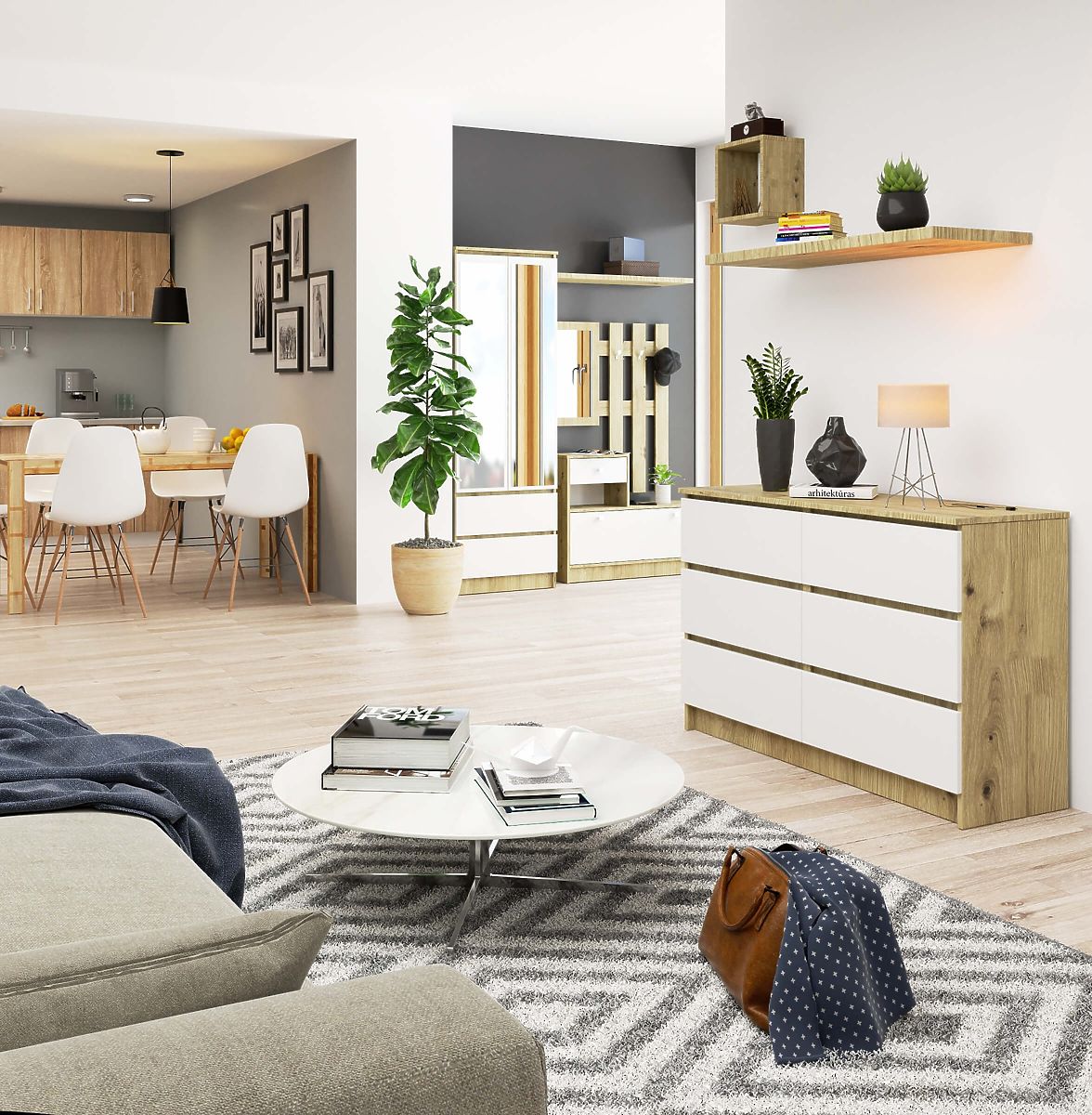 Comodă cu 6 sertare, corp stejar Artisan și față albă. .. mai mult