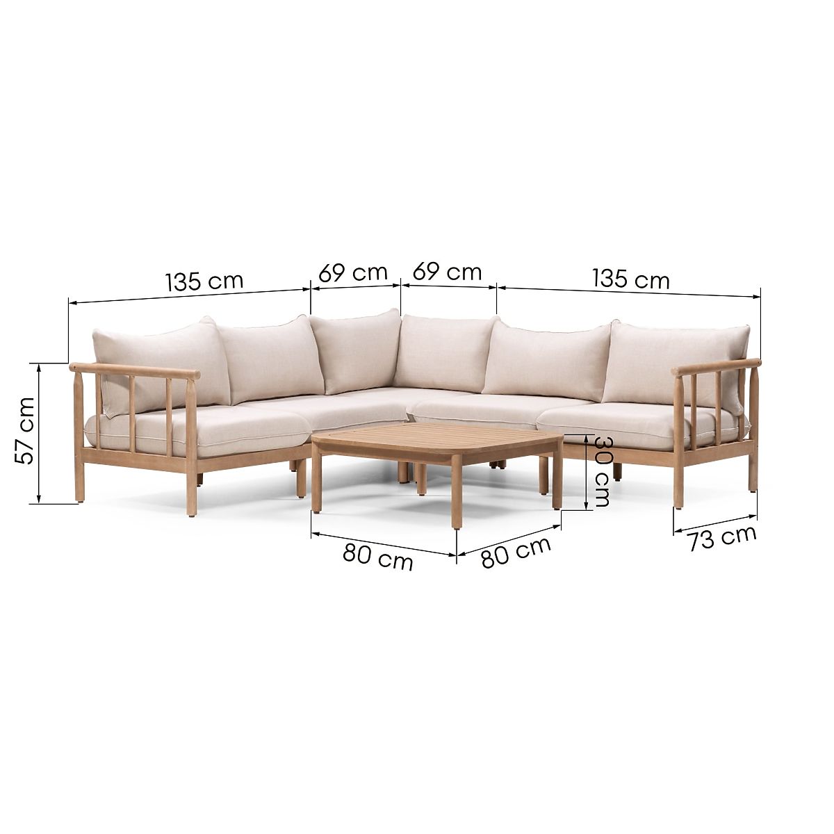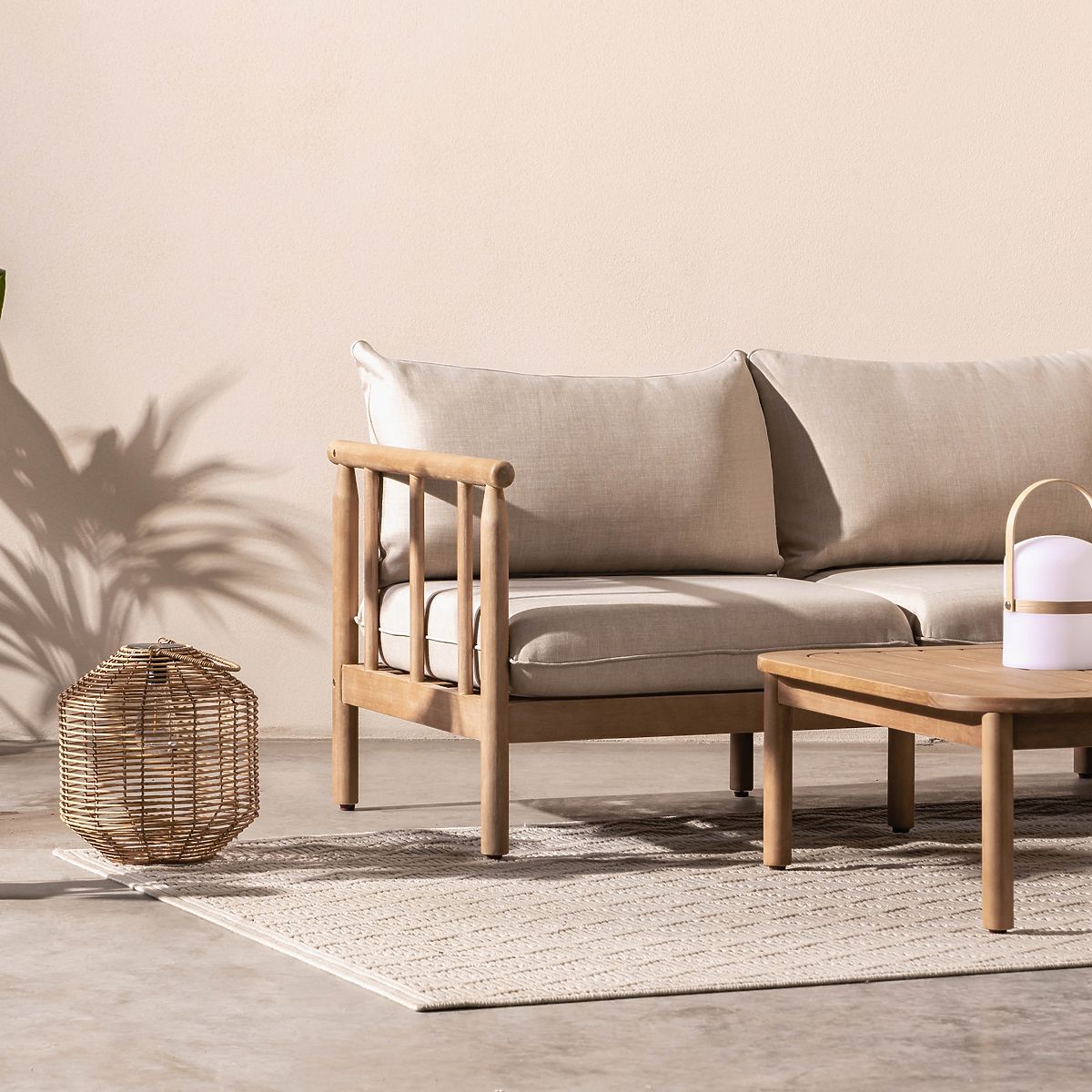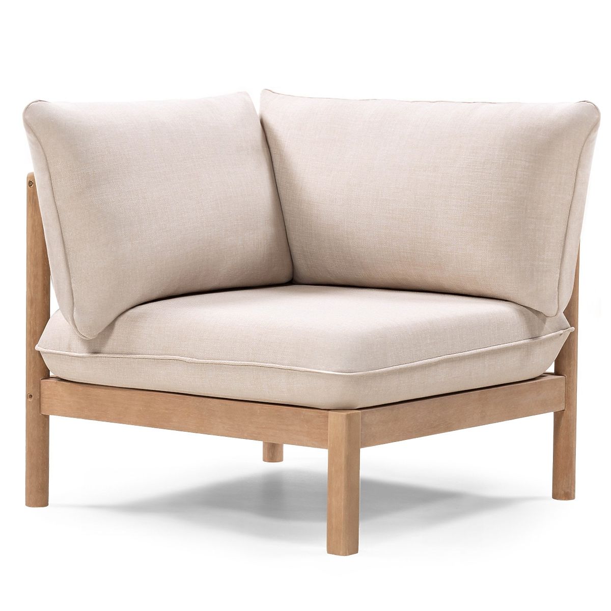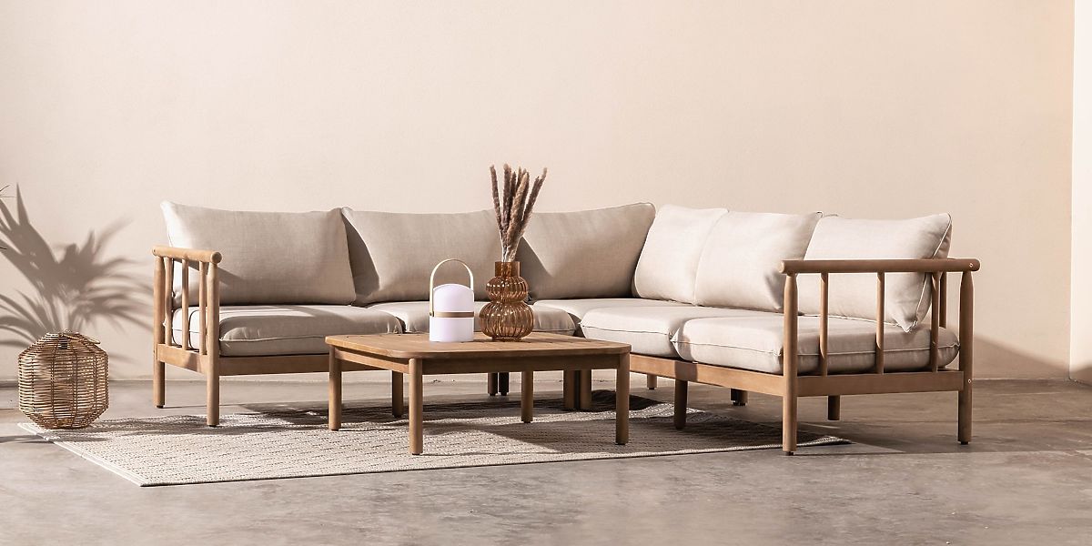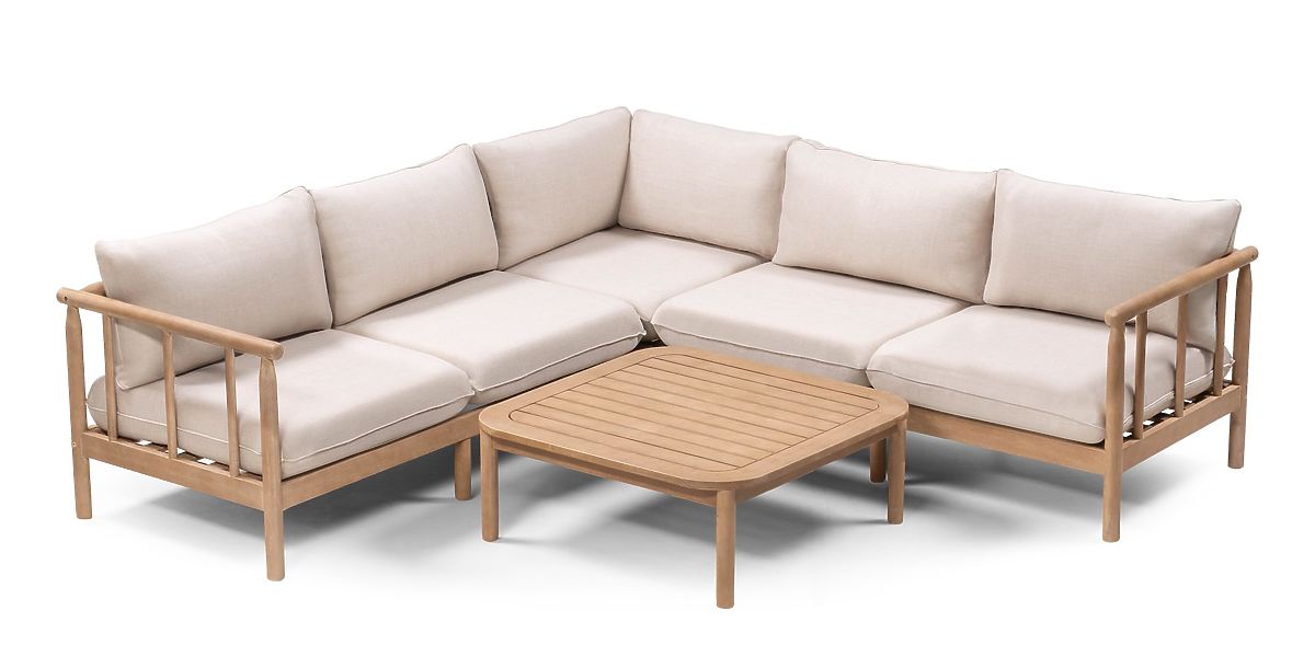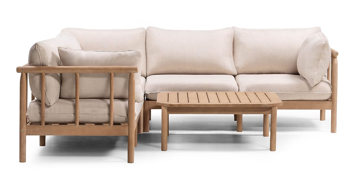 Canapea de colț de grădină cu măsuță Mortlake, lemn de eucalipt FSC, aspect de tec, bej deschis