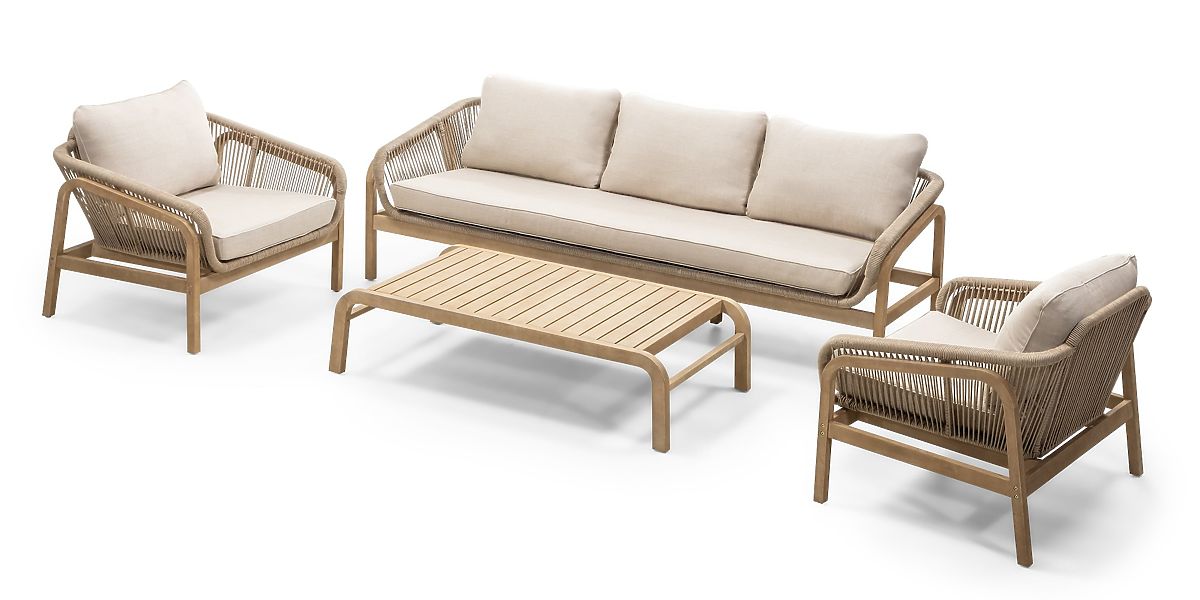 Setul este compus dintr-o canapea cu trei locuri, două fotolii și o măsuță de cafea. Datorită construcției robuste și materialelor de calitate, este potrivit pentru utilizare în exterior.