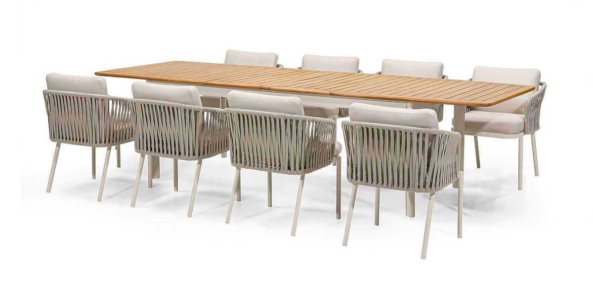 Setul de grădină Porticato este esența designului modern și a confortului de utilizare. Este compus dintr-o masă extensibilă și opt scaune stilate, care împreună creează un spațiu funcțional și estetic pentru relaxare în aer liber. Culoarea bej deschis, combinația de lemn și metal și detaliile atent alese asigură că setul se potrivește perfect atât cu verdeața grădinii, cât și cu o terasă modernă.