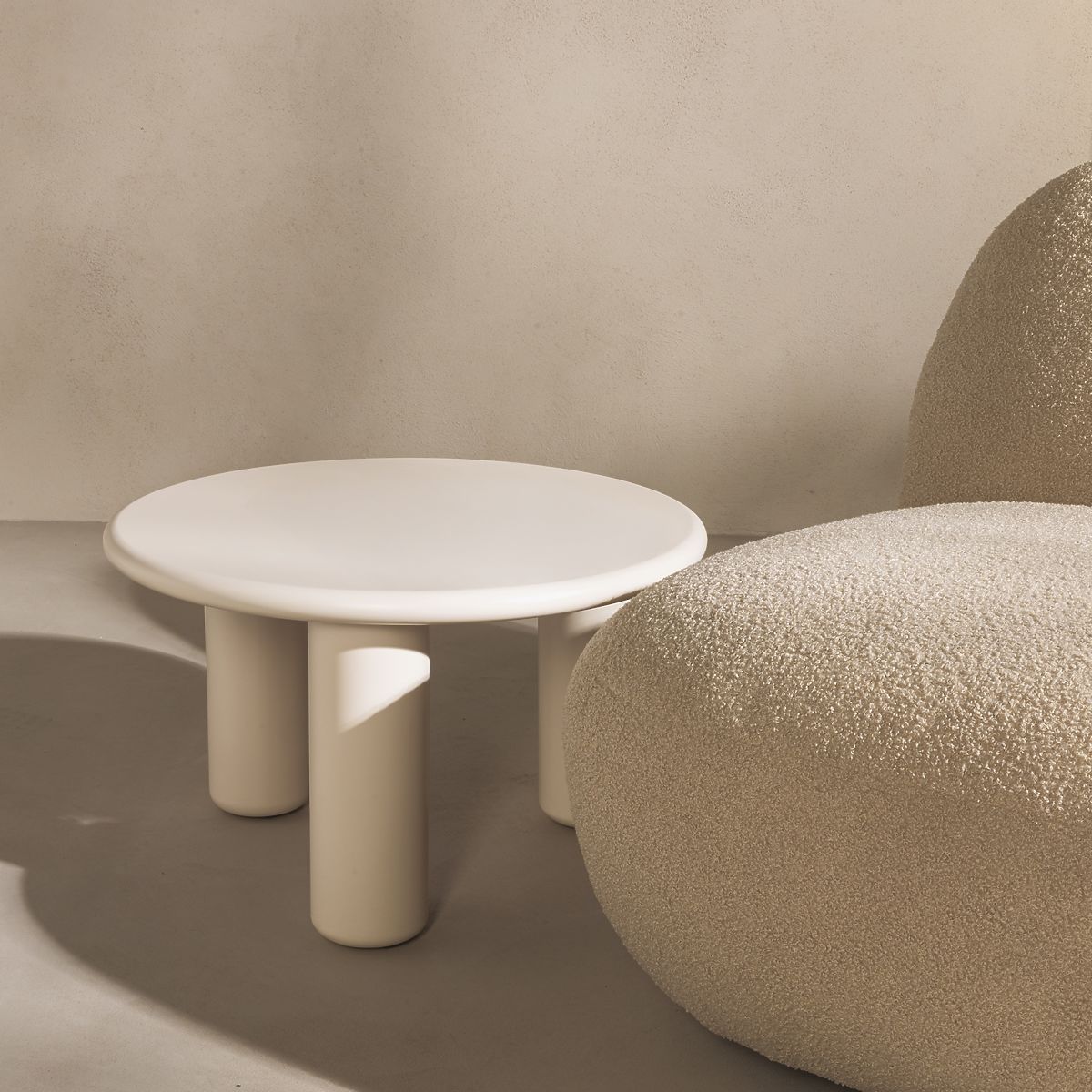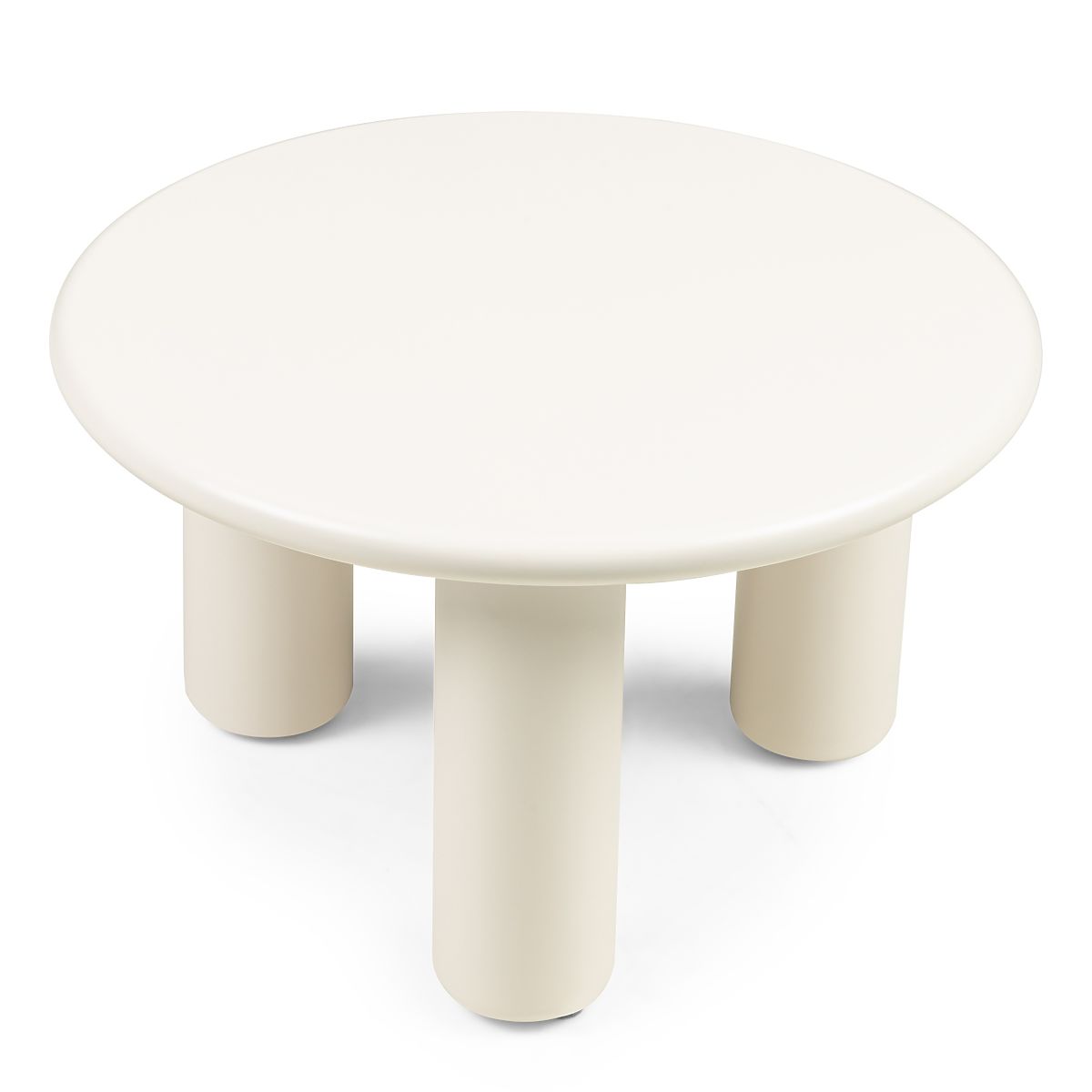 Masă de cafea crem, mată, cu margini rotunjite și trei picioare solide. .. mai mult