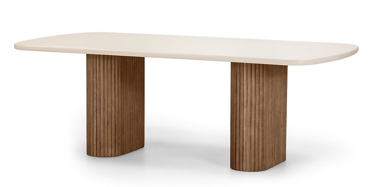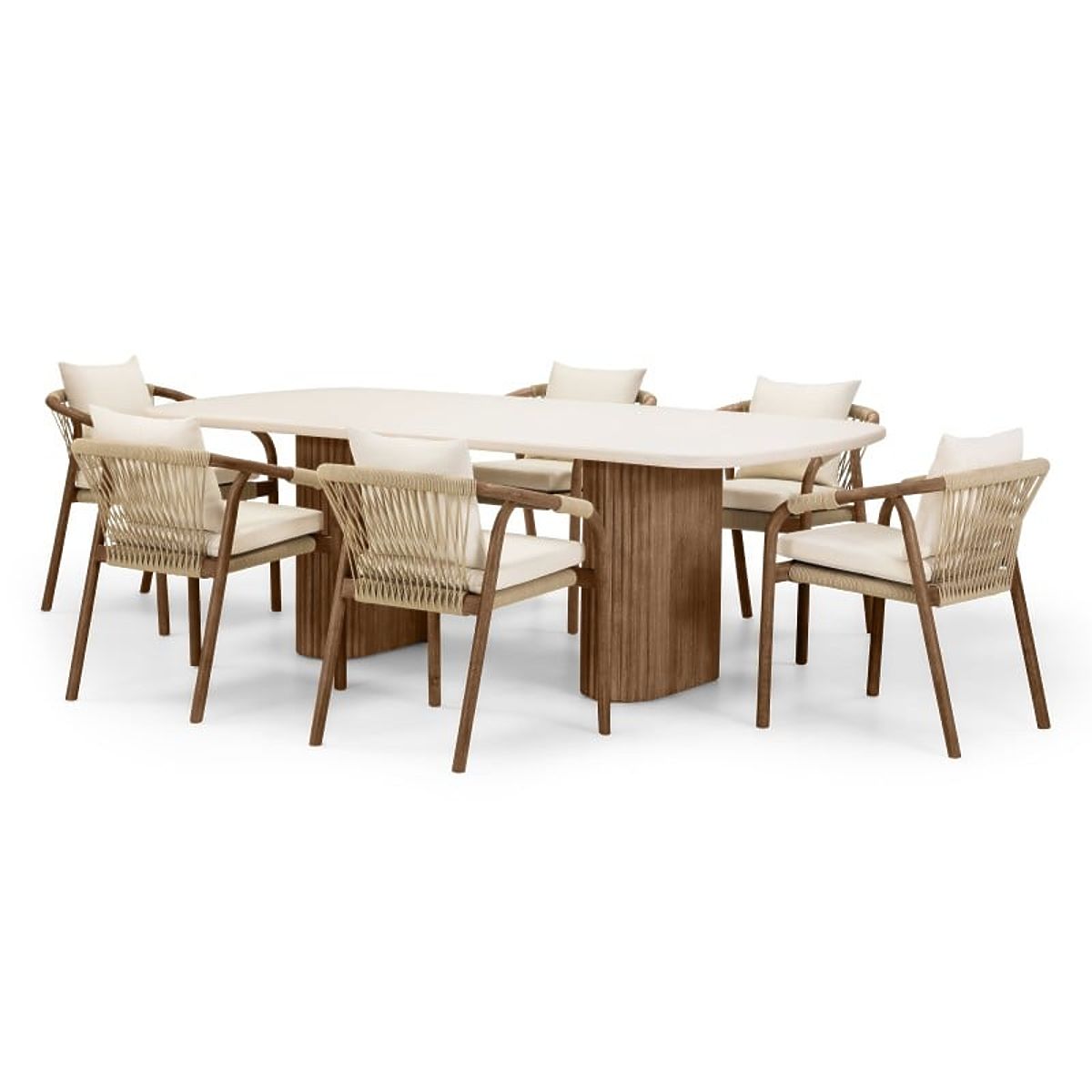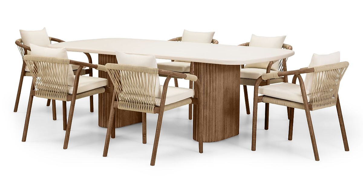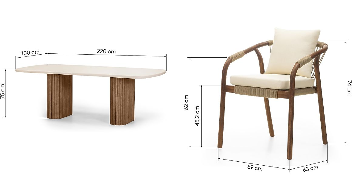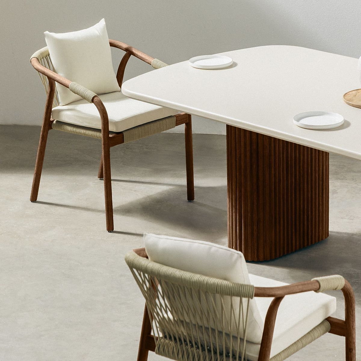 Elementul central al setului este masa cu un blat bej deschis, realizat din material inovator Superstone - un compozit care imită perfect piatra naturală, dar este mult mai rezistent la intemperii și radiații UV. Marginile sale ușor rotunjite adaugă lejeritate, în timp ce picioarele masive din lemn de acacia subliniază eleganța și conferă un caracter cald și natural.