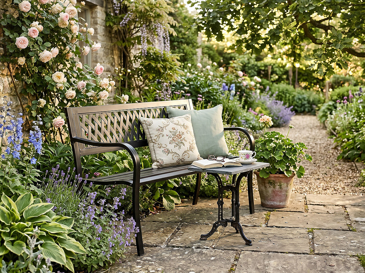✅Versatilitatea designului: Modelul clasic asigură că banca se potrivește perfect cu diverse aranjamente ale spațiilor exterioare.