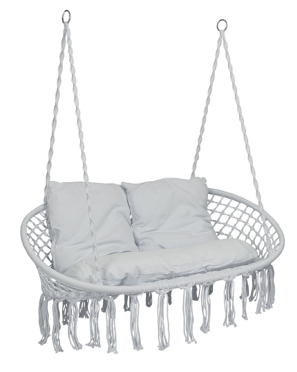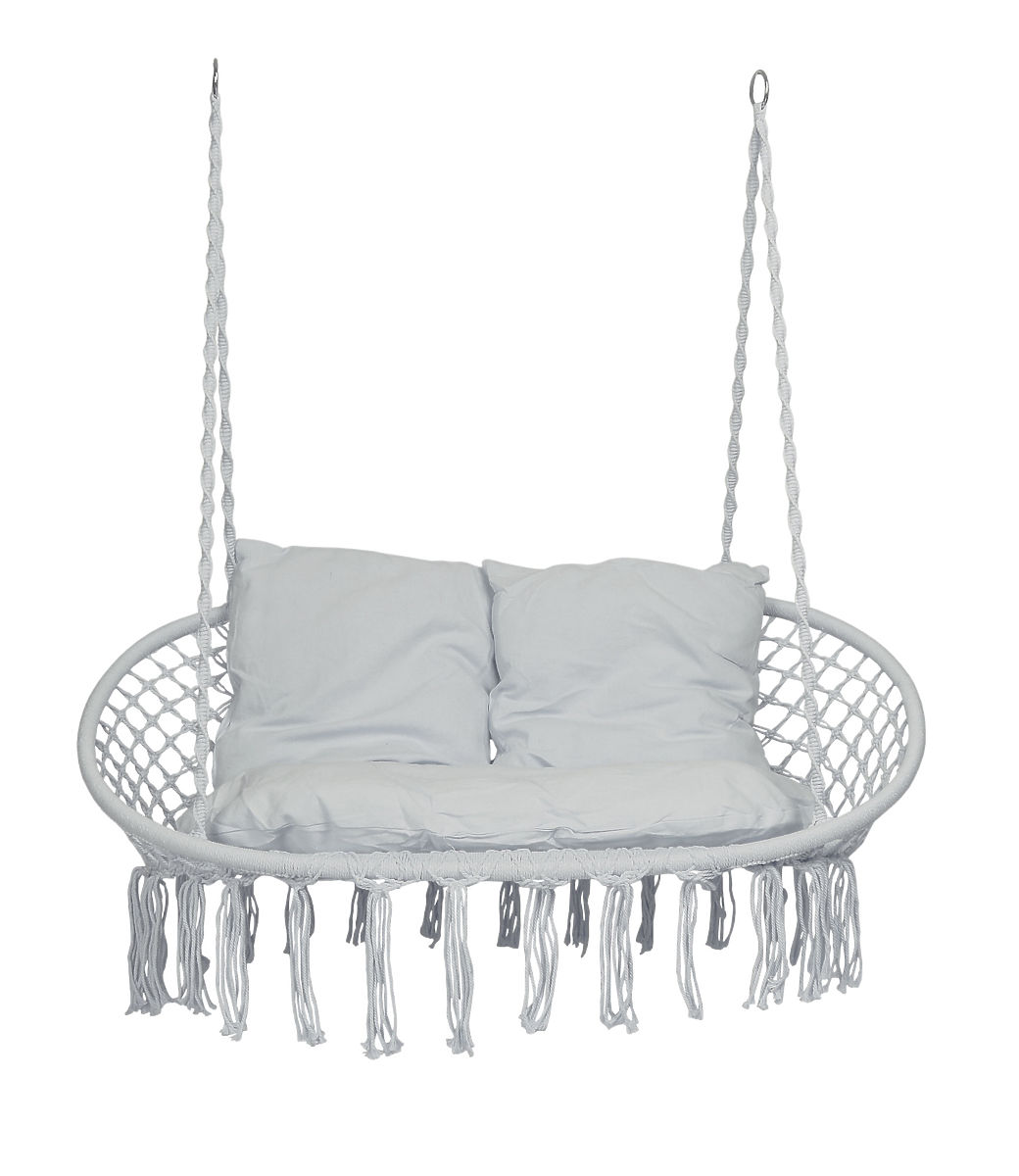 Leagănul de grădină Lagos este cea mai nouă tendință în designul interior. Ideal pentru relaxare în doi, suportă o greutate de până la 300 kg. Cadrul de oțel este acoperit cu modele frumoase împletite în stil boho. Frânghiile care susțin scaunul confortabil sunt terminate cu inele metalice, ceea ce facilitează semnificativ montarea leagănului într-un singur sau două puncte. Pernele moi incluse în set creează o compoziție plăcută și cresc semnificativ confortul utilizării.