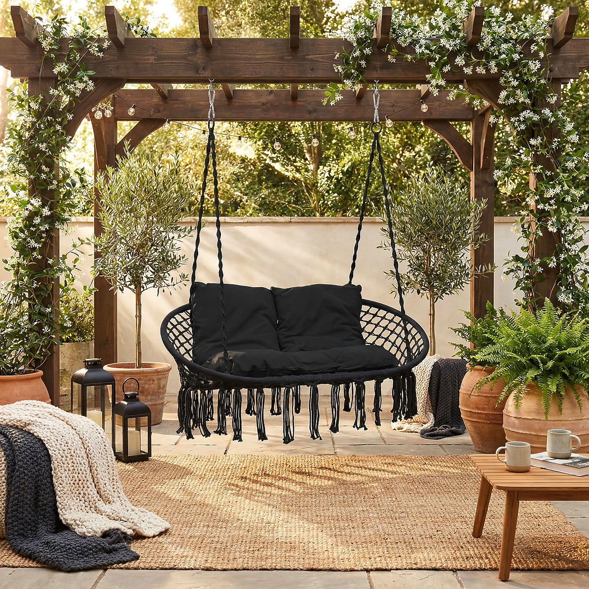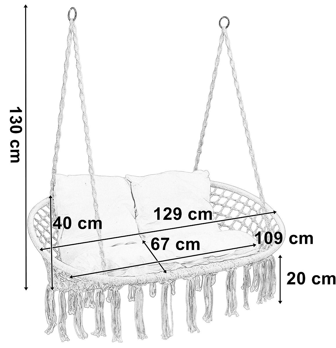 Leagănul de grădină Lagos este cea mai recentă tendință în designul interior. Ideal pentru relaxare în doi, suportă o greutate de până la 300 kg. Cadrul de oțel este acoperit cu modele frumoase împletite în stil boho. Frânghiile care susțin scaunul confortabil sunt terminate cu inele metalice, ceea ce facilitează semnificativ montarea leagănului într-un singur punct sau două puncte. Pernele moi incluse în set formează o compoziție plăcută ochiului și cresc semnificativ confortul utilizării.