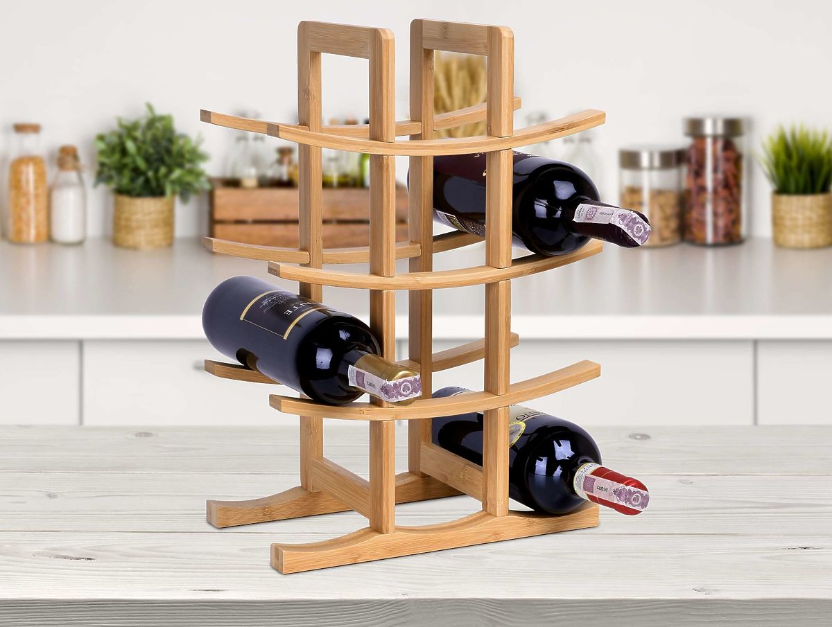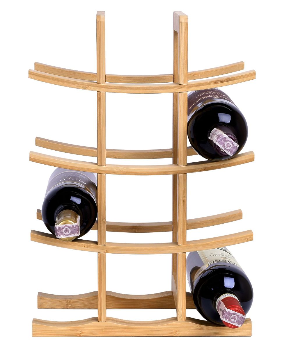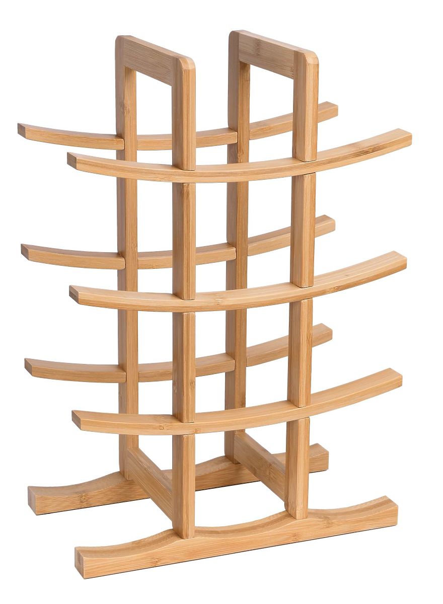 Acest suport de vin de înaltă calitate, realizat din lemn de bambus, poate susține până la 12 sticle de vin. Ergonomic - ocupă puțin spațiu, dar poate găzdui cu adevărat multe sticle. Suportul atrage atenția prin naturalețea sa și designul său ușor asiatic. Datorită celor două părți laterale și barelor transversale curbate, amintește de porțile japoneze și atrage privirile. Rezistența la umiditate face ca suportul să fie potrivit și pentru bucătărie. 4 tampoane din cauciuc moale asigură o poziționare sigură și protejează suprafața de zgârieturi inestetice. Suportul asigură depozitarea ideală a sticlelor de vin - dopurile nu se usucă.