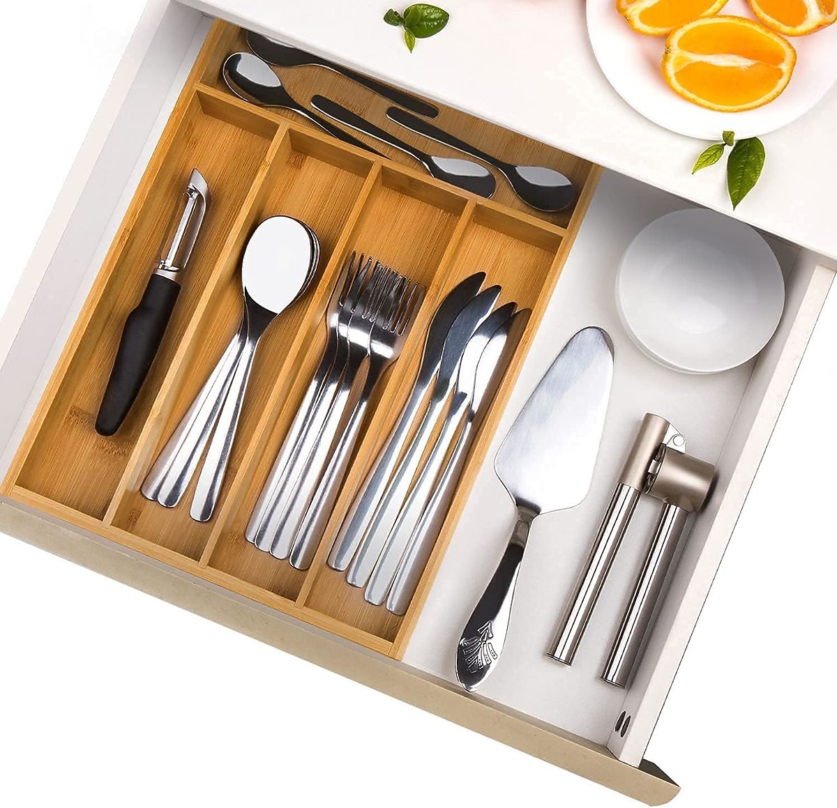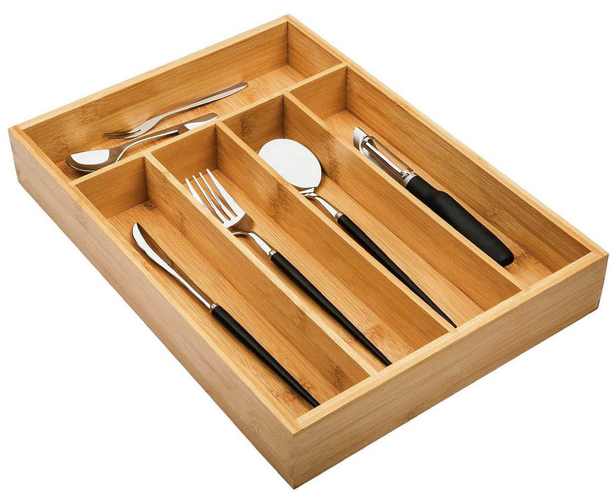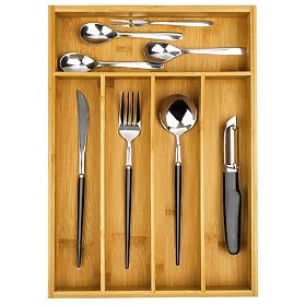 Dimensiunile de 25 x 35 cm asigură că se potrivește în majoritatea sertarelor, oferind 5 compartimente pentru tacâmuri și alte obiecte. Nu este doar un loc pentru tacâmuri, ci și un organizator versatil pentru depozitarea accesoriilor sau cosmeticelor în bucătărie, birou sau baie.