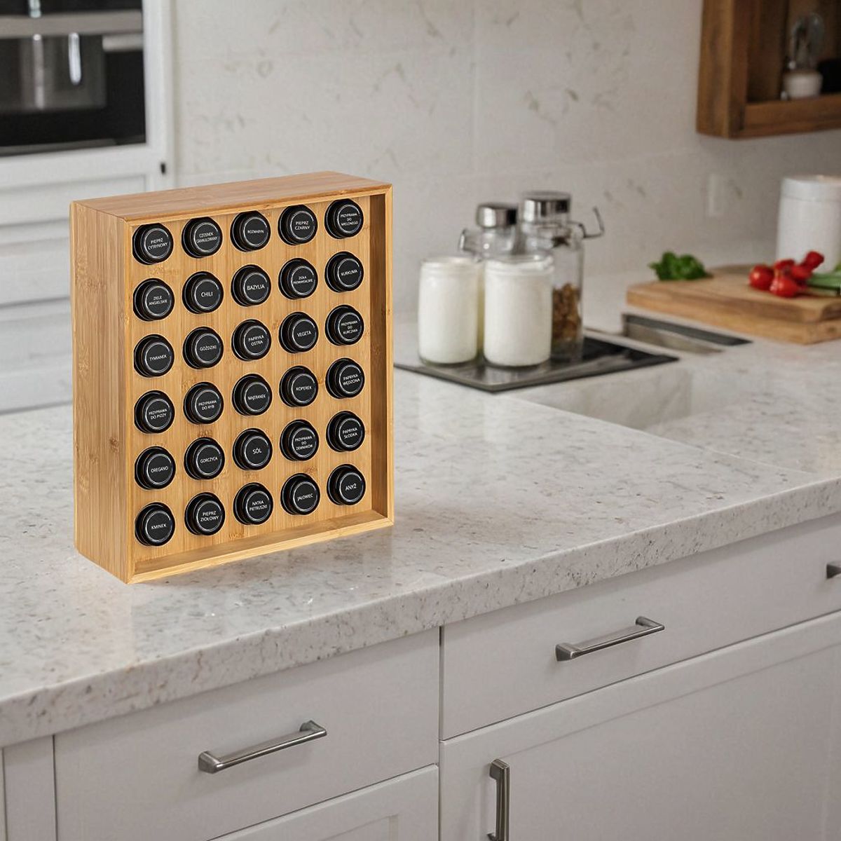 Suportul pentru condimente Safran Natural este un accesoriu deosebit pentru orice bucătărie, combinând eleganța cu funcționalitatea. Fabricat din bambus solid, este nu doar durabil, ci și ecologic. Cu 30 de borcane și etichete pentru condimente, menținerea ordinii este foarte simplă. Acest suport modern nu este doar o soluție practică, ci și un element decorativ care va adăuga caracter bucătăriei tale.