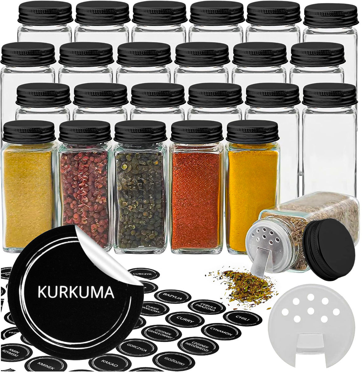 Setul elegant de borcane pentru condimente din sticlă transparentă cu capace metalice negre facilitează organizarea și adaugă eleganță bucătăriei. Conține 24 de borcane cu un volum de 120 ml fiecare, echipate cu etichete practice cu denumirile condimentelor. Datorită posibilității de aranjare pe orizontală sau verticală, setul este extrem de funcțional și se adaptează nevoilor individuale ale utilizatorului.