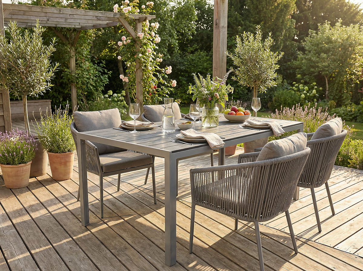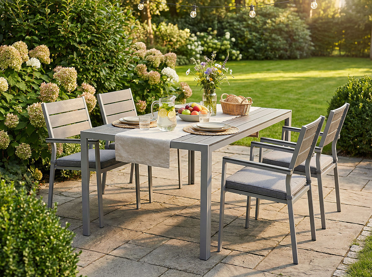 Masă de grădină din aluminiu cu blat imitând lemnul, dimensiuni 150x90 cm. .. mai mult