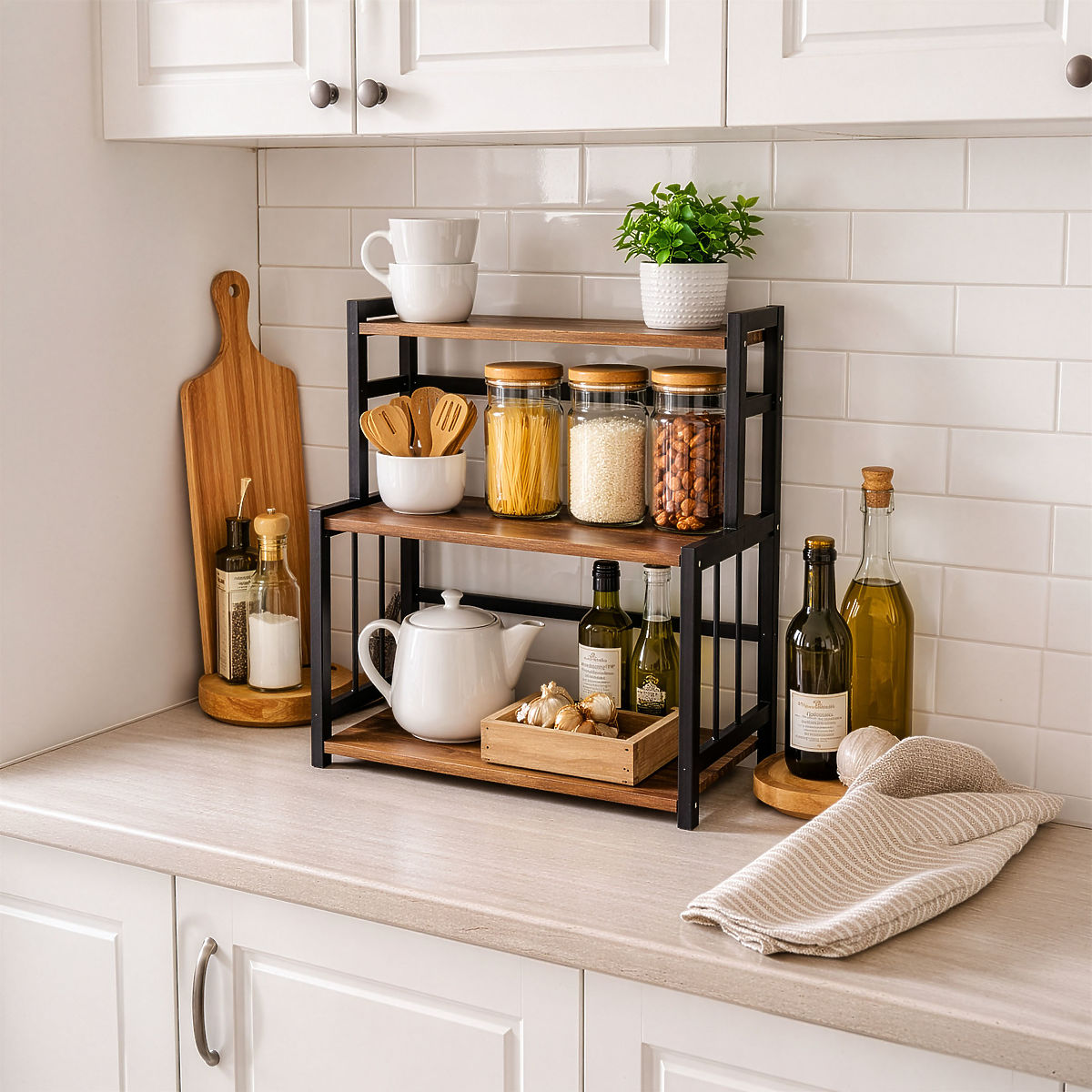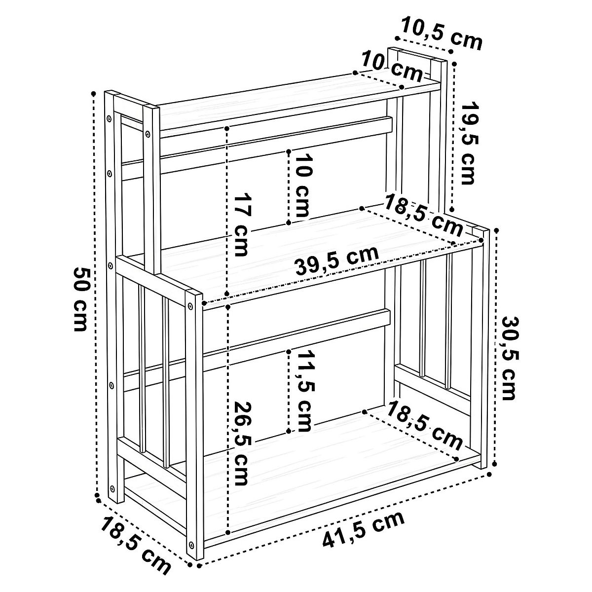 Raft de bucătărie pentru condimente CEZAR Wood Brown Model: Cezar | Model: Wood Brown | Destinație: Bucătărie, birou ⭐️Ideal pentru condimente ⭐️Trei rafturi spațioase ⭐️Design modern loft ⭐️Ideal pentru condimente ⭐️Achiziție direct de la producător ⚙️ Specificații tehnice: Material: lemn de bambus, plăci laminate Model: Wood brown Număr de rafturi: 3 Montaj: pentru asamblare proprie Capacitate maximă de încărcare a raftului mare: 4 kg Capacitate maximă de încărcare a raftului mic: 2 kg Capacitate totală maximă de încărcare: 10 kg ☑️ Dimensiuni: Înălțimea raftului: 50 cm Lățimea raftului: 41,5 cm Adâncimea raftului: 18,5 cm Lățimea rafturilor: 39,5 cm Înălțimea de la raftul mijlociu la cel superior: 17 cm Adâncimea raftului superior: 10 cm Informații suplimentare Culorile indicate sunt orientative - pot diferi de cele reale din cauza diferitelor setări ale monitoarelor și a procesului de editare a fotografiilor. Dimensiunile reale pot diferi de cele menționate mai sus. Toleranța erorilor poate fi de +/- 5%. Marca: Gockowiak Cod produs: 333426MG Cod EAN: 5902340333426 Model: wood brown Înălțime: 50 cm Lățime: 41,5 cm Materialul structurii: lemn de bambus, plăci laminate Stil: Loft, industrial, vintage