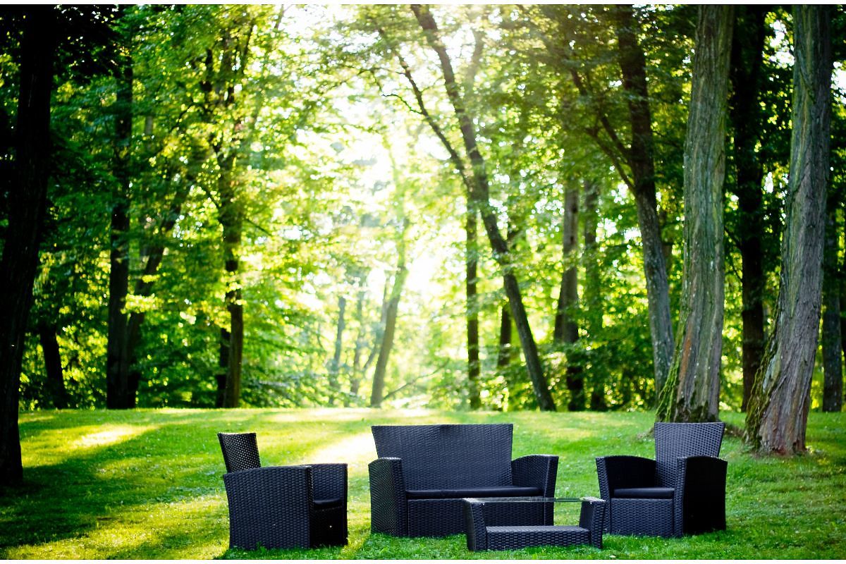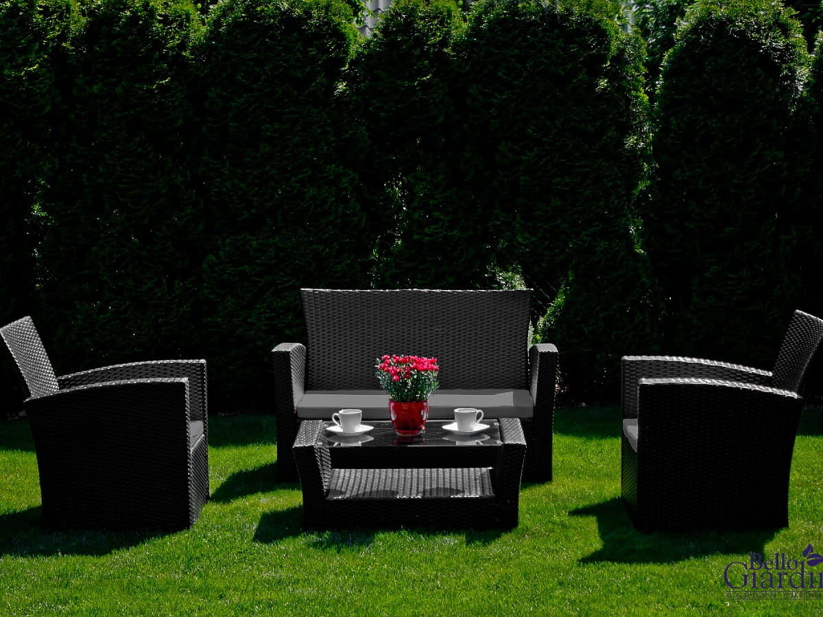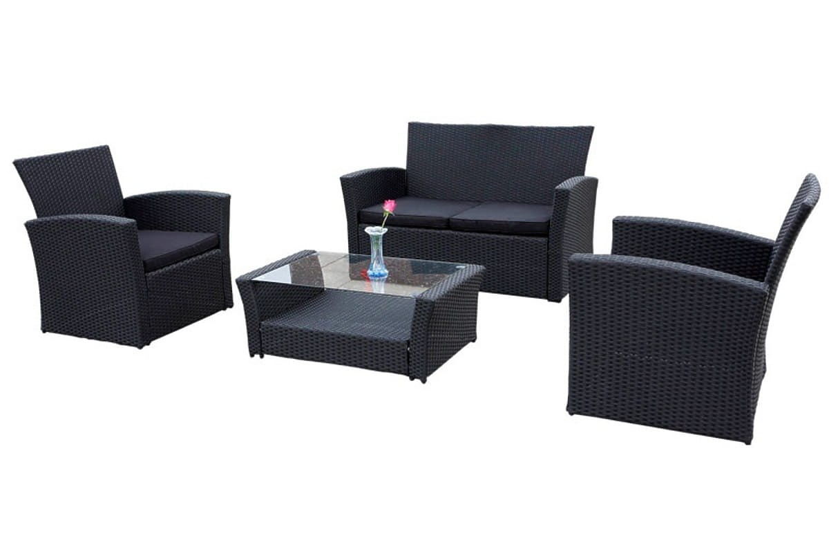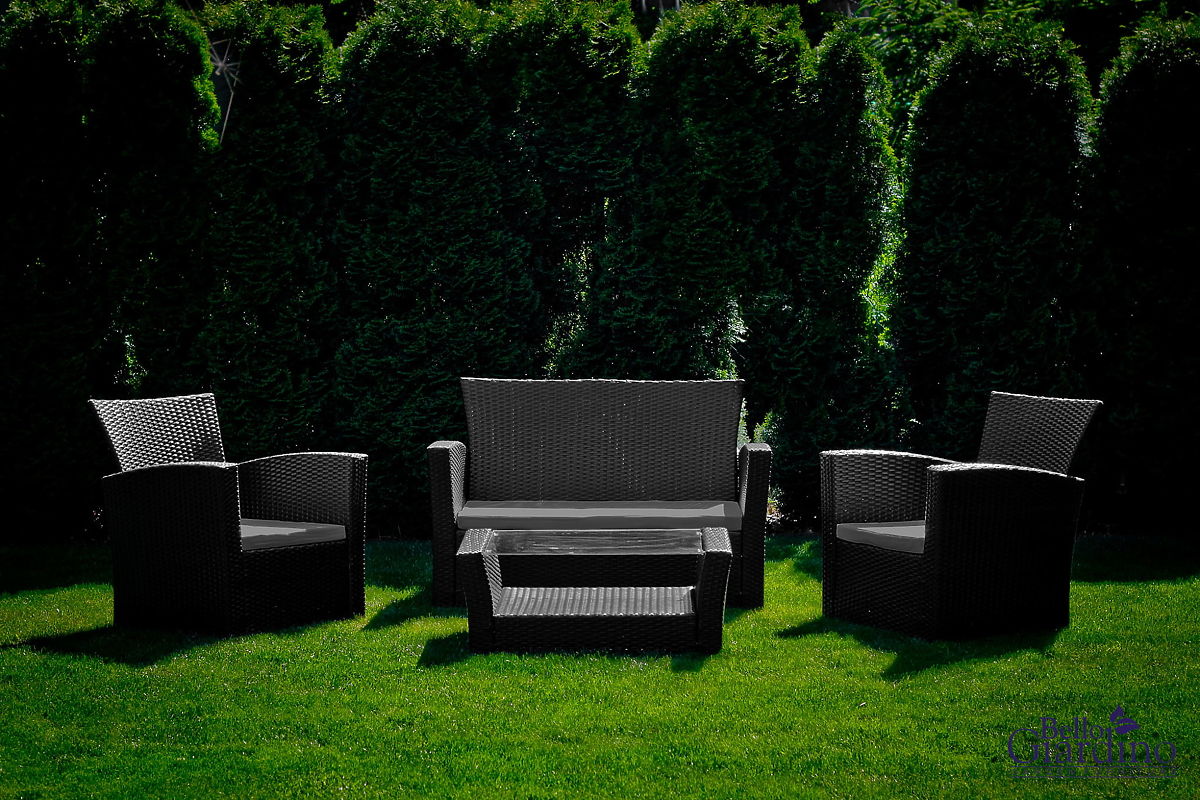 Lukahome.ro » Mobilier de grădină / Seturi de grădină / Mobilier de grădină din tehnoratan (canapea 123cm, 2 fotolii + masă) UNICO negru