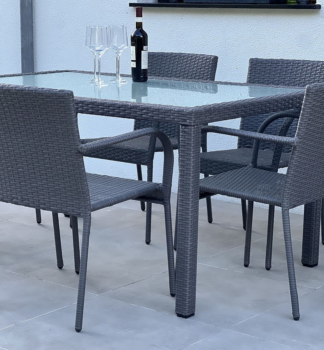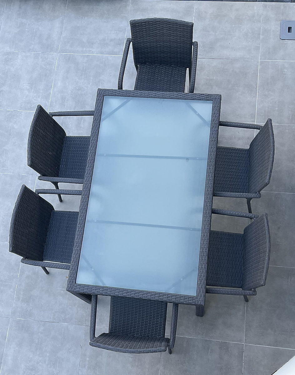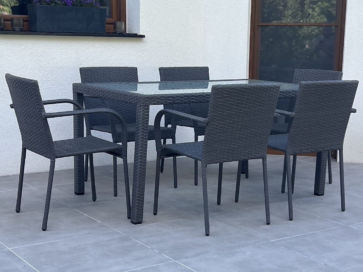 Construcția mobilierului: masă – aluminiu, scaune – oțel Setul conține 7 piese: 1 × masă (cu blat de sticlă mată de 5 mm securizată): lungime 150 cm, lățime 90 cm, înălțime 74 cm6 × scaune: lățime 56 cm, adâncime 50 cm, înălțime 84 cm, înălțimea șezutului de la sol 44 cm, înălțimea spătarului de la șezut 43 cm, lățimea șezutului 40 cm, adâncimea șezutului 43 cmSetul este livrat pe 1 palet cu dimensiunile 120 × 80 × 170 cm, greutate 60 kg. Posibilitatea achiziționării de perne pentru scaune aici. Scaunele pot fi utilizate imediat după despachetare. Scaunele sunt stivuibile (pot fi introduse unul în altul), ceea ce facilitează considerabil depozitarea și economisește spațiu. Masa este destinată unei asamblări simple conform instrucțiunilor incluse. Masa de sticlă mată este încadrată într-un cadru de tehnoratan. Tehnoratanul este rezistent la condiții meteorologice dăunătoare, însă pentru a păstra aspectul mai mult timp, recomandăm achiziționarea unei huse de protecție. Husa de culoare gri închis este unică și are un șnur inferior pentru strângere. Toate husele sunt cusute la comandă, timpul de realizare este de aproximativ 14 zile lucrătoare.