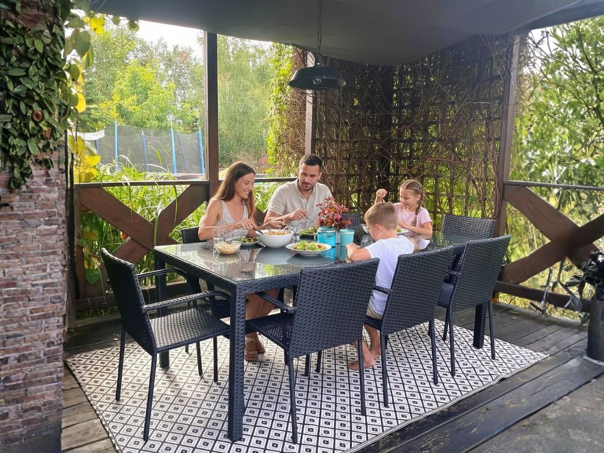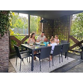 Mobilierul de grădină SOTTILE este soluția ideală pentru cei care apreciază eleganța, confortul și durabilitatea mobilierului de grădină. Setul de masă destinat pentru 8 persoane oferă condiții excelente pentru organizarea întâlnirilor cu cei dragi, combinând confortul extraordinar cu un design unic. Fiecare element al setului de grădină este realizat din tehnoratan de înaltă calitate, ceea ce nu doar asigură longevitatea și rezistența sa la influențele meteorologice dăunătoare, dar permite și o întreținere ușoară. Precizia excelentă a prelucrării subliniază caracterul luxos al mobilierului, făcând ca mobilierul din tehnoratan SOTTILE să devină o podoabă minunată pentru orice spațiu exterior. Masa cu scaunele este rezistentă la ploaie și radiații UV, garantând că își păstrează aspectul estetic pentru mulți ani, devenind un element indispensabil al echipamentului fiecărei grădini, terase sau patio. Culoarea setului SOTTILE: negru – structură uniformă, ușor dungată. Împletitură: tehnoratan 7-8mm x 1,2mm. Construcția mobilierului: masă – aluminiu, scaune – oțel. Setul este compus din 9 elemente: 1 x masă: lungime: 200 cm, lățime: 100 cm, înălțime: 74 cm, blat din sticlă transparentă realizat din sticlă securizată de 5 mm, așezat pe împletitură de tehnoratan. 8 x scaune: lățime: 56 cm, adâncime: 50 cm, înălțime: 84 cm, înălțimea de la podea la șezut: 44 cm, înălțimea spătarului de la șezut: 43 cm, lățimea șezutului: 40 cm, adâncimea șezutului: 43 cm. Setul este expediat pe 1 paletă cu dimensiunile de 120x80x210 cm, greutate 80 kg. Scaunele pot fi utilizate imediat după scoaterea din cutii. Scaunele sunt stivuibile (posibilitatea de a le introduce unul în altul), ceea ce facilitează depozitarea și mobilierul nu ocupă mult spațiu. Masa este destinată unei asamblări simple, individuale, conform instrucțiunilor incluse. Blatul de sticlă al mesei este fixat pe ventuze de silicon, care îl protejează de alunecare. Posibilitatea de a achiziționa perne pentru scaune aici. Tehnoratanul este rezistent la influențele meteorologice dăunătoare, dar pentru a păstra aspectul neschimbat al mobilierului pentru mai mult timp, recomandăm achiziționarea unei huse de protecție. Husa de culoare gri închis este dintr-o singură piesă și are un șnur de strângere în partea de jos. Toate husele sunt cusute la comandă și timpul de realizare este de aproximativ 14 zile lucrătoare. Imaginați-vă un mobilier de grădină care depășește așteptările dumneavoastră în toate privințele – de la durabilitate la design. Acesta este BELLO GIARDINO, unde fiecare detaliu contează și luxul întâlnește funcționalitatea: Calitate nepieritoare: Ratanul nostru sintetic garantează că mobilierul va rezista ani de zile, fără a-și pierde frumusețea sau durabilitatea. Rezistență la intemperii: Mobilierul nostru face față celor mai dificile condiții meteorologice, de la soarele arzător la iernile geroase, rămânând mereu frumos. Confort luxos: Pernele groase și moi invită la relaxare, oferind un confort greu de găsit în altă parte. Ușurință și rezistență: Construcția din aluminiu combină cele mai bune calități ale ambelor lumi – este ușoară, dar extrem de stabilă. Design care încântă: Fiecare element al mobilierului nostru a fost proiectat având în vedere estetica și funcționalitatea, pentru a se potrivi în orice mediu. Indiferent dacă sunteți un iubitor al minimalismului sau apreciați aranjamentele bogate și elegante, mobilierul nostru vă va îndeplini așteptările, depășind limitele funcționalității și esteticii obișnuite. Asigurăm că chiar și cei mai exigenți clienți nu vor rezista confortului și stilului oferit de BELLO GIARDINO. Transformați-vă grădina, terasa sau balconul într-o oază de relaxare și eleganță, pe care ați dorit-o întotdeauna. Nu așteptați, descoperiți BELLO GIARDINO astăzi și transformați-vă spațiile exterioare în locuri despre care ați visat întotdeauna. Fotografii ale mobilierului de la clienții noștri:
