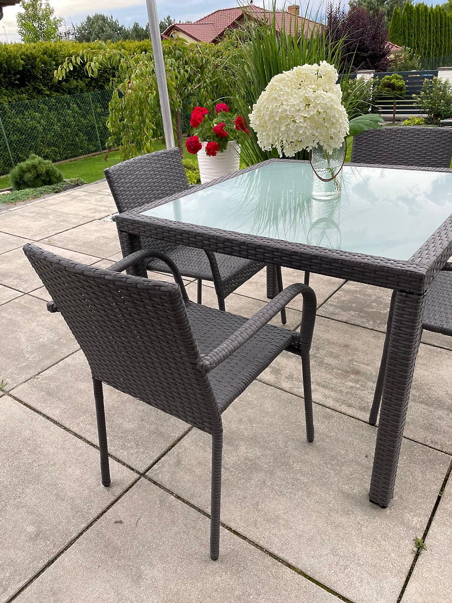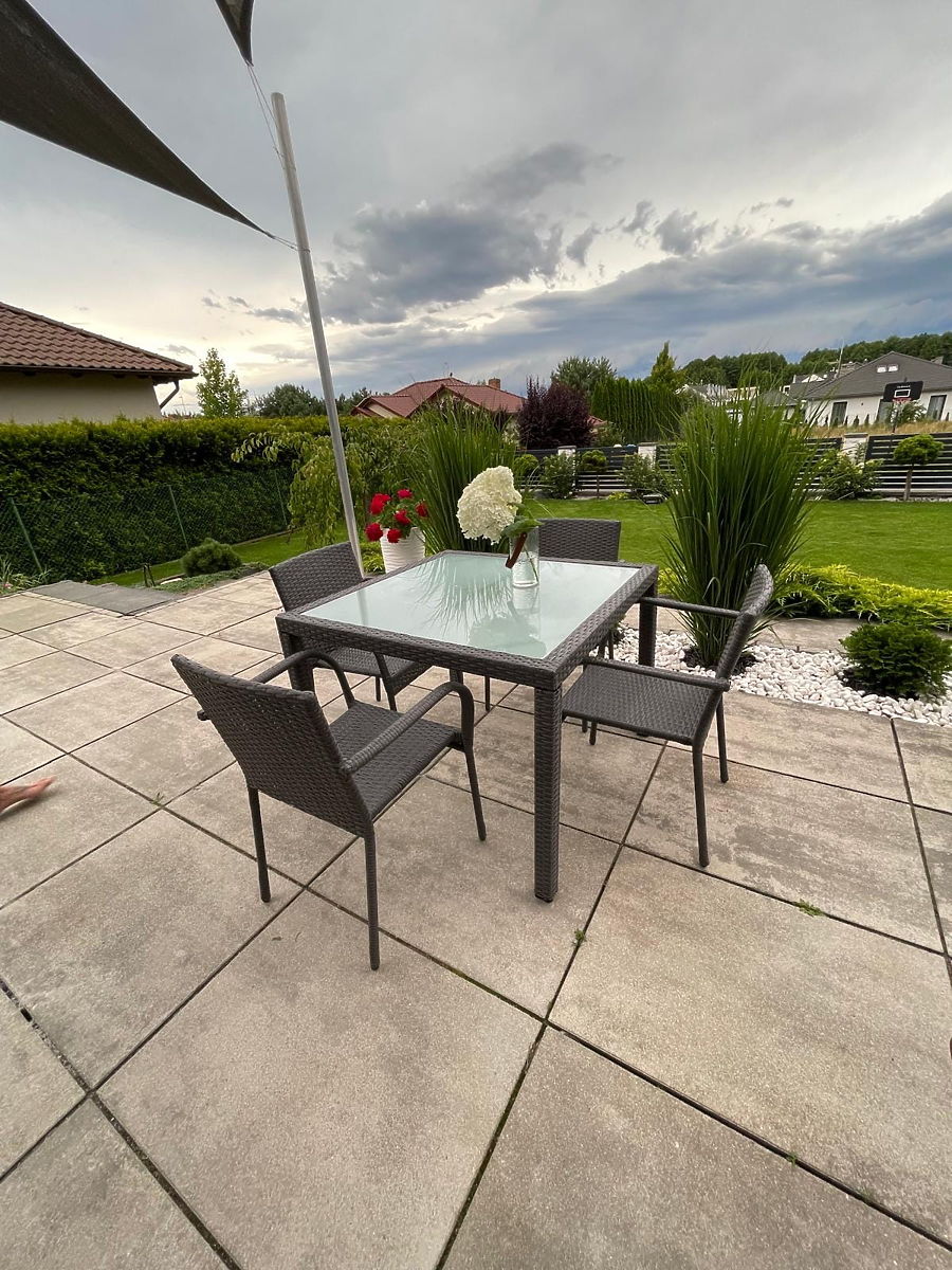 Mobilierul de grădină AVVICENTE este chintesența designului modern și a inovației, conceput cu atenție pentru cei mai exigenți utilizatori. Setul de masă este fabricat din tehnoratan de cea mai înaltă calitate, care nu doar asigură o rezistență mecanică excepțională, dar oferă și protecție împotriva efectelor negative ale radiațiilor UV, permițând păstrarea aspectului original al mobilierului pentru o perioadă îndelungată. Datorită construcției ușoare din aluminiu a mesei, mobilierul din tehnoratan ECCELLENTE este extrem de practic și ușor de transportat, permițând adaptarea facilă a spațiului conform preferințelor personale de relaxare la umbră sau la soare. Ideal pentru cei care caută o combinație de eleganță, durabilitate și funcționalitate în grădina sau pe terasa lor. Culoarea setului AVVICENTE: gri, cu structură periată. Împletitură: tehnoratan 7-8mm x 1,2mm. Structura mobilierului: masă – aluminiu, scaune – oțel. Setul este compus din 5 piese: 1 x masă: lungime: 100 cm, lățime: 100 cm, înălțime: 74 cm, blat din sticlă transparentă de 5mm securizată, așezat pe împletitura de tehnoratan. 4 x scaune: lățime: 56 cm, adâncime: 50 cm, înălțime: 84 cm, înălțime de la sol la șezut: 44 cm, înălțimea spătarului de la șezut: 43 cm, lățimea șezutului: 40 cm, adâncimea șezutului: 43 cm. Setul este livrat pe 1 palet cu dimensiunile 120x80x115 cm, greutate 50 kg. Scaunele pot fi utilizate imediat după scoaterea din cutii. Scaunele sunt stivuibile (pot fi introduse unul în altul), facilitând depozitarea și economisind spațiu. Masa este destinată unei asamblări simple, individuale, conform instrucțiunilor incluse. Blatul de sticlă al mesei este fixat pe ventuze din silicon, care îl protejează de alunecare. Tehnoratanul este rezistent la influențele meteorologice dăunătoare, totuși, pentru a păstra aspectul neschimbat al mobilierului pentru mai mult timp, recomandăm achiziționarea unei huse de protecție. Husa de culoare gri închis este dintr-o singură piesă și are un șnur de strângere la bază. Toate husele sunt cusute la comandă, iar timpul de realizare este de aproximativ 14 zile lucrătoare. Posibilitatea de a achiziționa perne pentru scaune aici. Imaginați-vă un mobilier de grădină care depășește așteptările dumneavoastră în toate privințele – de la durabilitate la design. Acesta este BELLO GIARDINO, unde fiecare detaliu contează și luxul se întâlnește cu funcționalitatea: Calitate indestructibilă: Ratanul nostru sintetic garantează că mobilierul va rezista ani de zile fără a-și pierde frumusețea sau durabilitatea. Rezistență la intemperii: Mobilierul nostru face față celor mai dure condiții meteorologice, de la soarele arzător la iernile geroase, rămânând mereu frumos. Confort luxos: Pernele groase și moi invită la relaxare, oferind un confort greu de găsit în altă parte. Ușurință și durabilitate: Construcția din aluminiu combină cele mai bune din ambele lumi – este ușoară, dar extrem de stabilă. Design care încântă: Fiecare element al mobilierului nostru a fost conceput cu atenție la estetică și funcționalitate, pentru a se potrivi în orice mediu. Fie că sunteți un iubitor al minimalismului sau apreciați aranjamentele bogate și elegante, mobilierul nostru vă va îndeplini așteptările, depășind limitele funcționalității și esteticii obișnuite. Asigurăm că chiar și cei mai exigenți clienți nu vor rezista confortului și stilului oferit de BELLO GIARDINO. Transformați-vă grădina, terasa sau balconul într-o oază de relaxare și eleganță pe care ați dorit-o întotdeauna. Nu așteptați, descoperiți BELLO GIARDINO astăzi și transformați-vă spațiile exterioare în locuri de vis. Fotografii ale mobilierului de la clienții noștri: