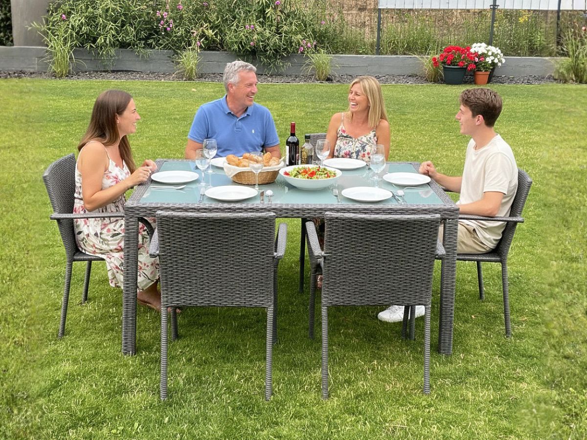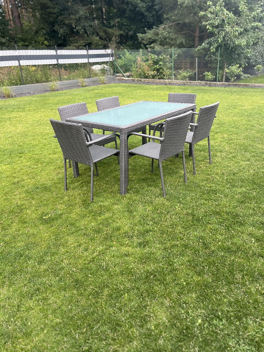 Setul de mobilier de sufragerie AVVICENTE a fost conceput pentru iubitorii de soluții stilate, dar și practice, fiind un complement perfect pentru orice spațiu exterior. Construcția ușoară a mesei permite mutarea facilă, oferind o versatilitate excepțională și permițând adaptarea aranjamentului la nevoile individuale. Mobilierul de grădină din tehnoratan nu doar încântă prin eleganța sa, dar garantează și rezistență la ploaie, radiații solare intense și îngheț, eliminând necesitatea unei întrețineri intense. În plus, scaunele confortabile oferă un maxim de confort pentru relaxare, făcând fiecare moment petrecut în aer liber și mai plăcut. Setul de mobilier de grădină AVVICENTE este sinonim cu durabilitate și eleganță, satisfăcând perfect nevoile utilizatorilor moderni care caută mobilier ce va servi ani de zile. Culoarea setului AVVICENTE: gri, structură periată Împletitură: tehnoratan 7-8mm x 1,2mm Construcția mobilierului: masă - aluminiu, scaune - oțel Setul este compus din 7 elemente: 1 x masă (cu blat de sticlă mată din sticlă securizată de 5mm): lungime: 150 cm lățime: 90 cm înălțime: 74 cm 6 x scaune: lățime: 56 cm adâncime: 50 cm înălțime: 84 cm înălțime de la podea la șezut: 44 cm înălțimea spătarului de la șezut: 43 cm lățimea șezutului: 40 cm adâncimea șezutului: 43 cm Setul este livrat pe 1 palet cu dimensiunile 120x80x170 cm, greutate 60 kg Posibilitatea de a achiziționa perne pentru scaune aici. Scaunele pot fi utilizate imediat după scoaterea din cutii. Scaunele sunt stivuibile (posibilitatea de a le introduce una în alta), facilitând depozitarea și mobilierul nu ocupă mult spațiu. Masa este destinată unei asamblări simple, individuale, conform instrucțiunilor incluse. Blatul de sticlă mată al mesei este încorporat într-un cadru din tehnoratan. Tehnoratanul este rezistent la influențele meteorologice dăunătoare, însă pentru a păstra aspectul neschimbat al mobilierului pentru mai mult timp, recomandăm achiziționarea unei huse de protecție. Husa de culoare gri închis este dintr-o singură bucată și are un șnur de strângere în partea de jos. Toate husele sunt realizate la comandă și timpul de realizare este de aproximativ 14 zile lucrătoare. Imaginați-vă mobilierul de grădină care depășește așteptările dvs. în toate privințele – de la durabilitate la design. Aceasta este BELLO GIARDINO, unde fiecare detaliu contează și luxul întâlnește funcționalitatea: Calitate constantă: Ratanul nostru sintetic garantează că mobilierul va rezista ani de zile, fără a-și pierde frumusețea sau durabilitatea. Rezistență la intemperii: Mobilierul nostru face față celor mai dure condiții meteorologice, de la soarele arzător la iernile geroase, rămânând mereu frumos. Confort luxos: Pernele groase și moi invită la relaxare, oferind un confort greu de găsit în altă parte. Ușurință și stabilitate: Construcția din aluminiu combină cele mai bune din ambele lumi – este ușoară, dar extrem de stabilă. Design care încântă: Fiecare element al mobilierului nostru a fost proiectat ținând cont de estetică și funcționalitate, pentru a se potrivi în orice mediu. Indiferent dacă sunteți un iubitor al minimalismului sau apreciați aranjamentele bogate și elegante, mobilierul nostru vă va îndeplini așteptările, depășind limitele funcționalității și esteticii obișnuite. Garantăm că chiar și cei mai exigenți clienți nu vor rezista confortului și stilului oferit de BELLO GIARDINO. Transformați-vă grădina, terasa sau balconul într-o oază de relaxare și eleganță pe care ați dorit-o întotdeauna. Nu așteptați, descoperiți BELLO GIARDINO astăzi și transformați-vă spațiile exterioare în locuri despre care ați visat mereu. Fotografiile mobilierului de la clienții noștri: