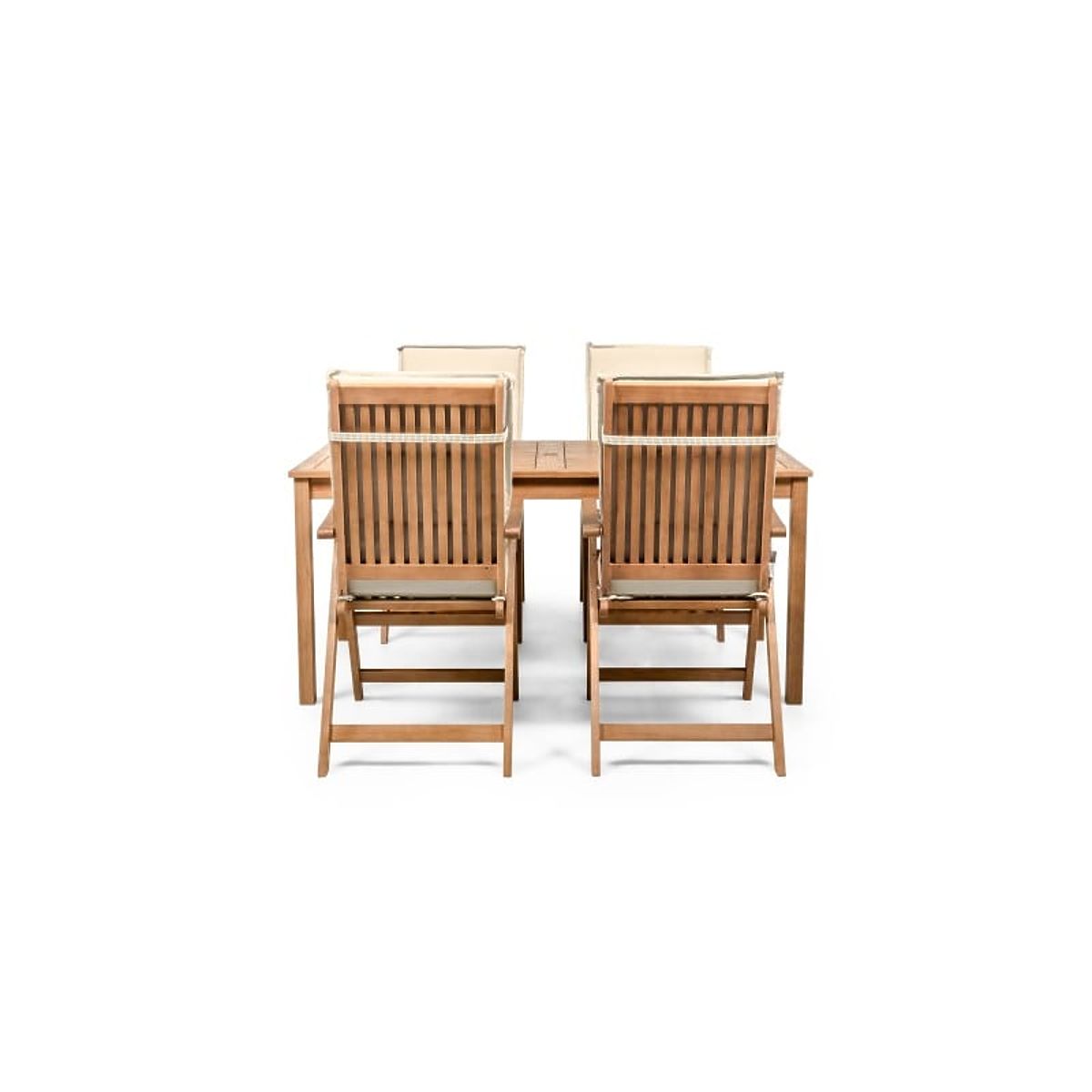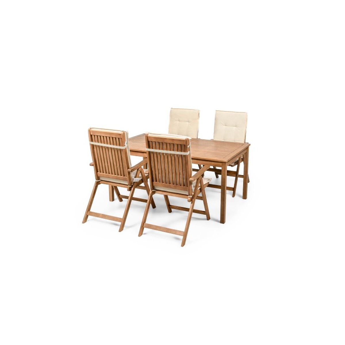 Lukahome.ro » Mobilier de grădină / Seturi de grădină / Set de grădină Familis masă 160 cm + 4 scaune cu spătare reglabile și perne crem, lemn