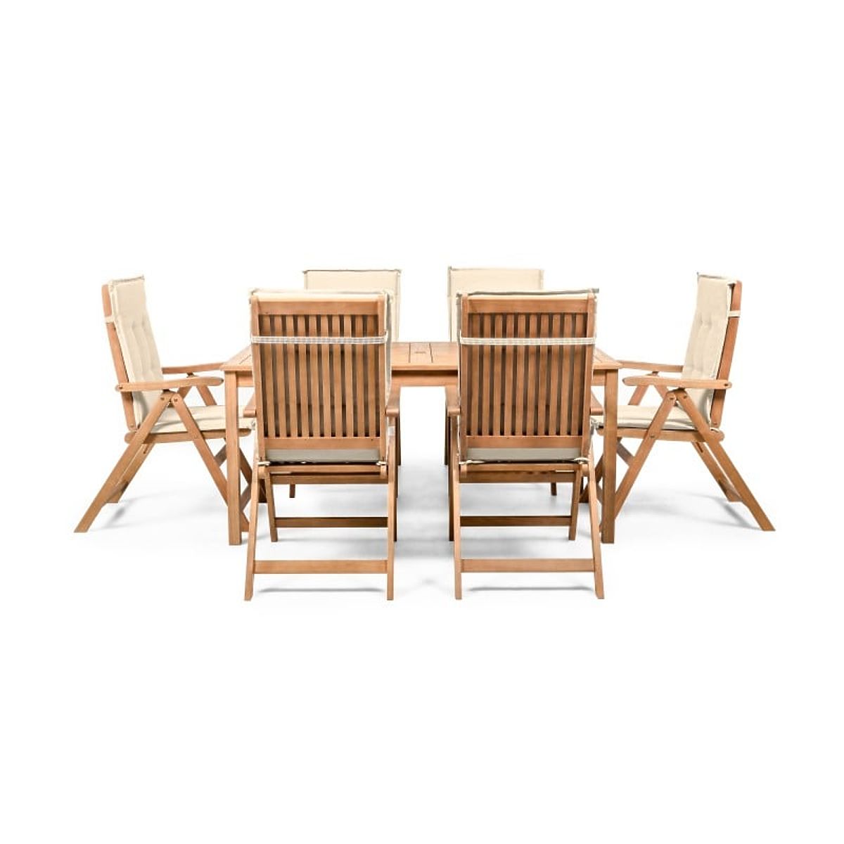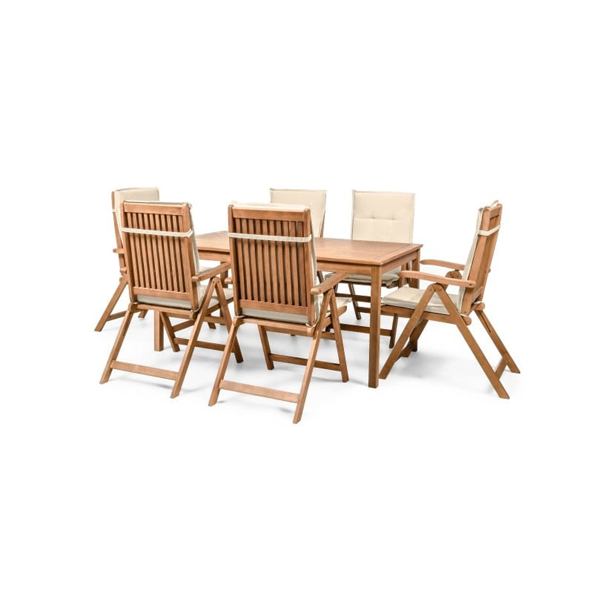 Lukahome.ro » Mobilier de grădină / Seturi de grădină / Set de grădină Familis masă 160 cm + 6 scaune cu spătare reglabilă și perne crem, lemn