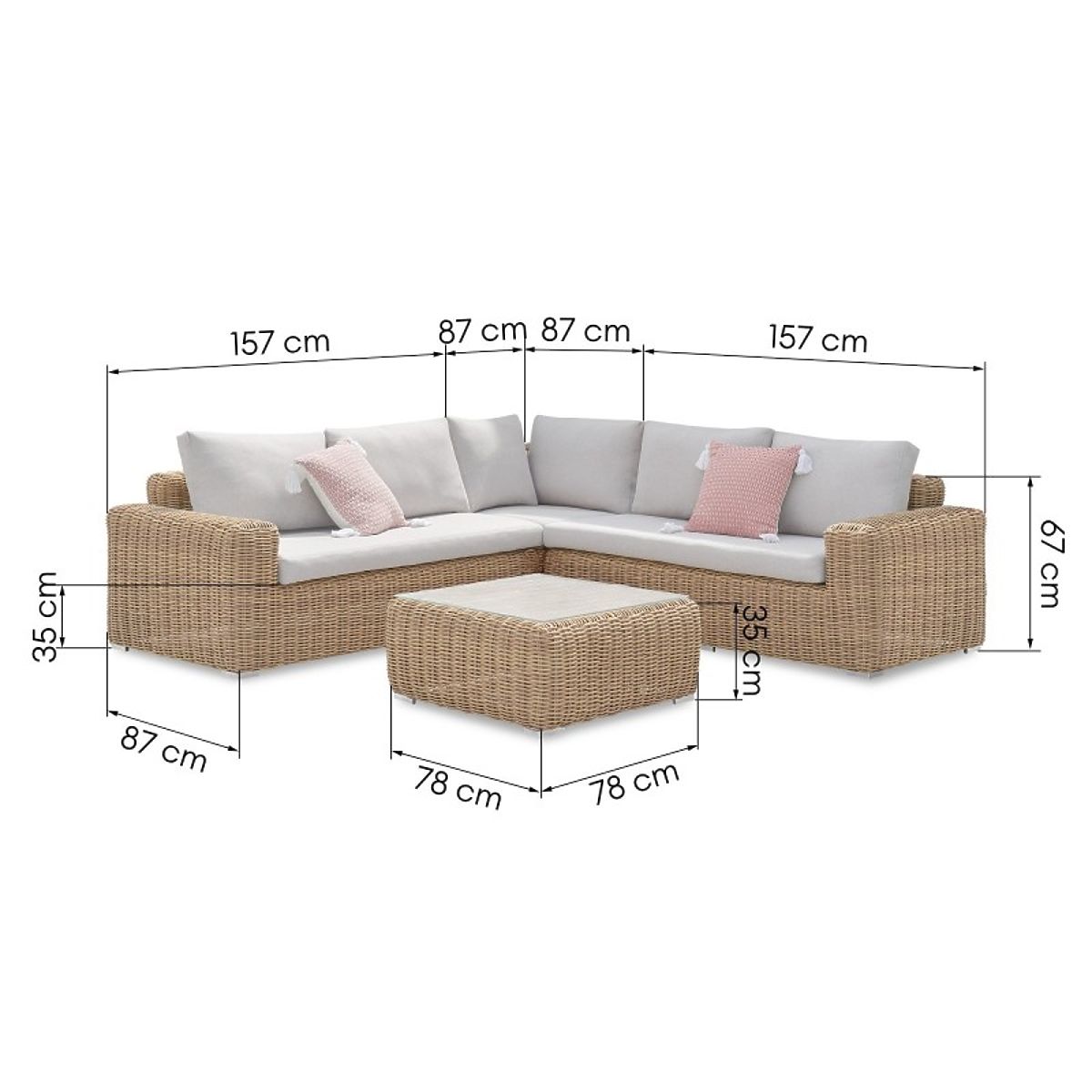 Colțarul de grădină Sandy este un set elegant de relaxare cu o măsuță confortabilă și perne moi, ideal pentru relaxare în grădină. Fabricat din ratan sintetic durabil, combină stilul și confortul și se potrivește perfect în orice spațiu exterior.