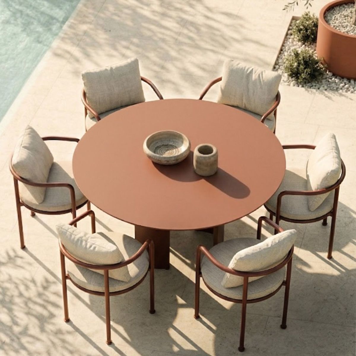 Masa Amarello se integrează delicat în spațiu și reprezintă eleganța într-o formă minimalistă. Construcția din aluminiu, solidă dar ușoară, oferă confort și stil, devenind un detaliu deosebit care completează orice aranjament de grădină.