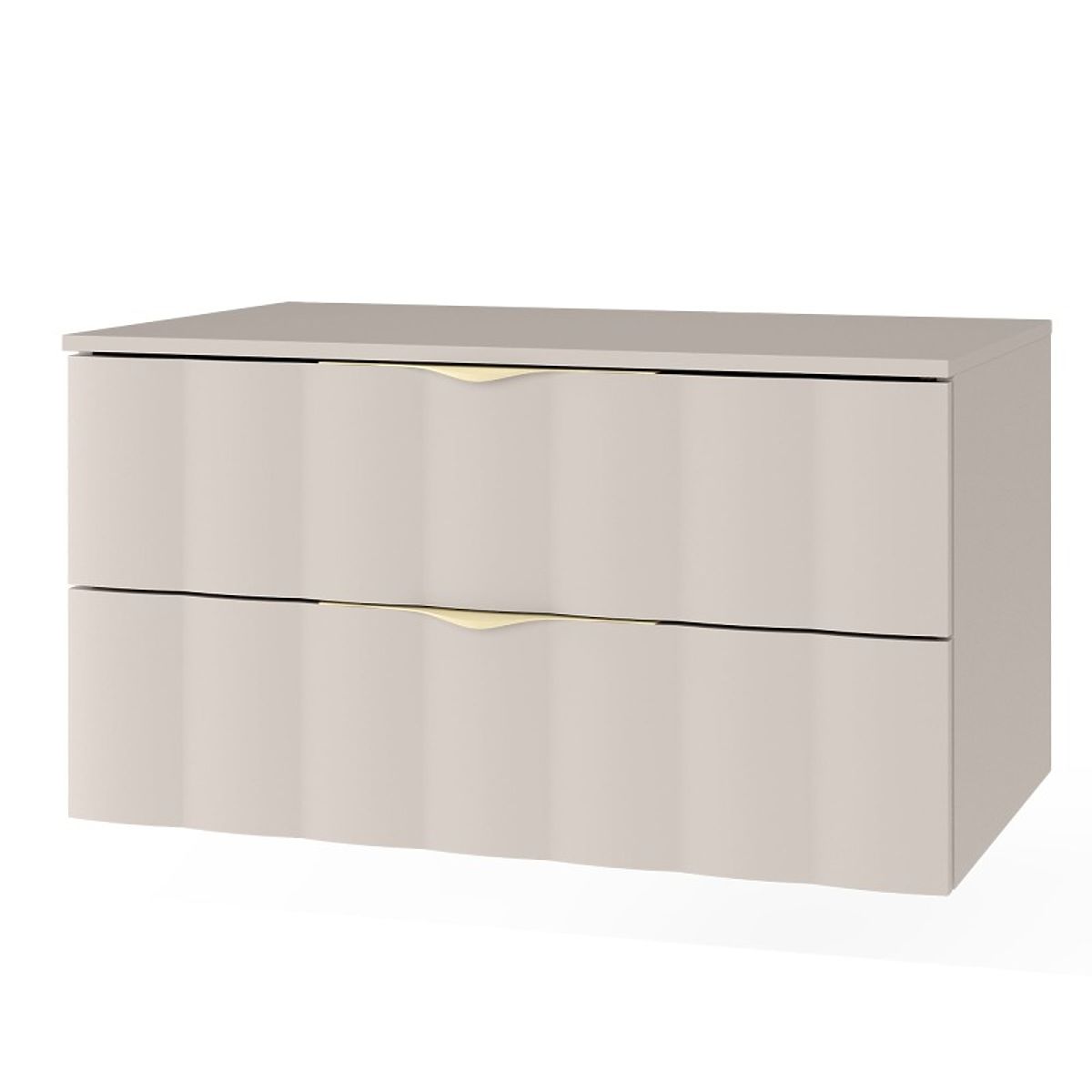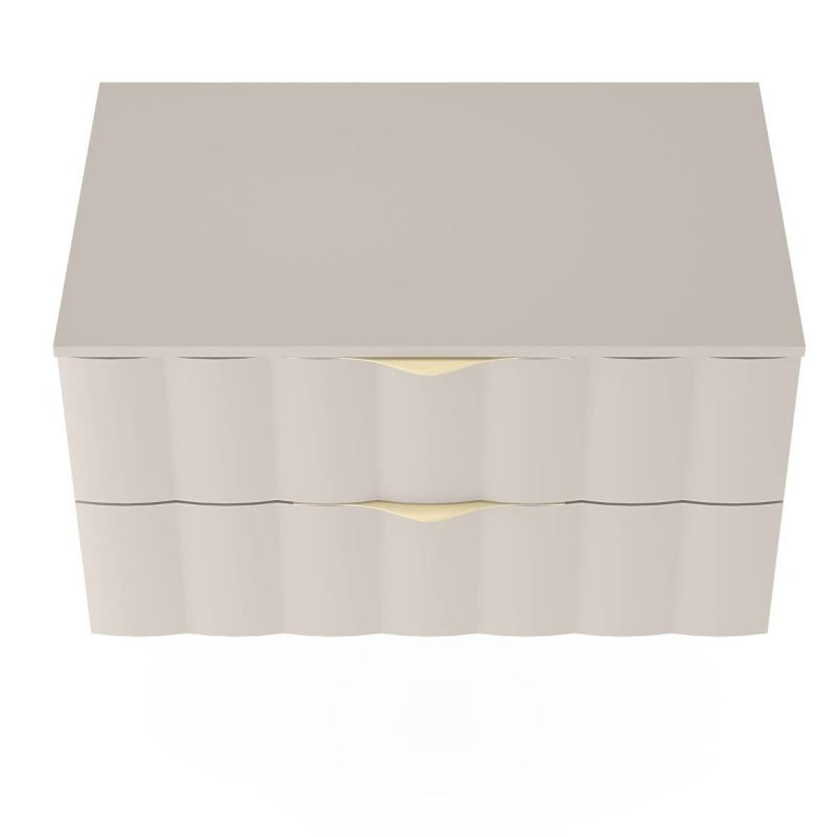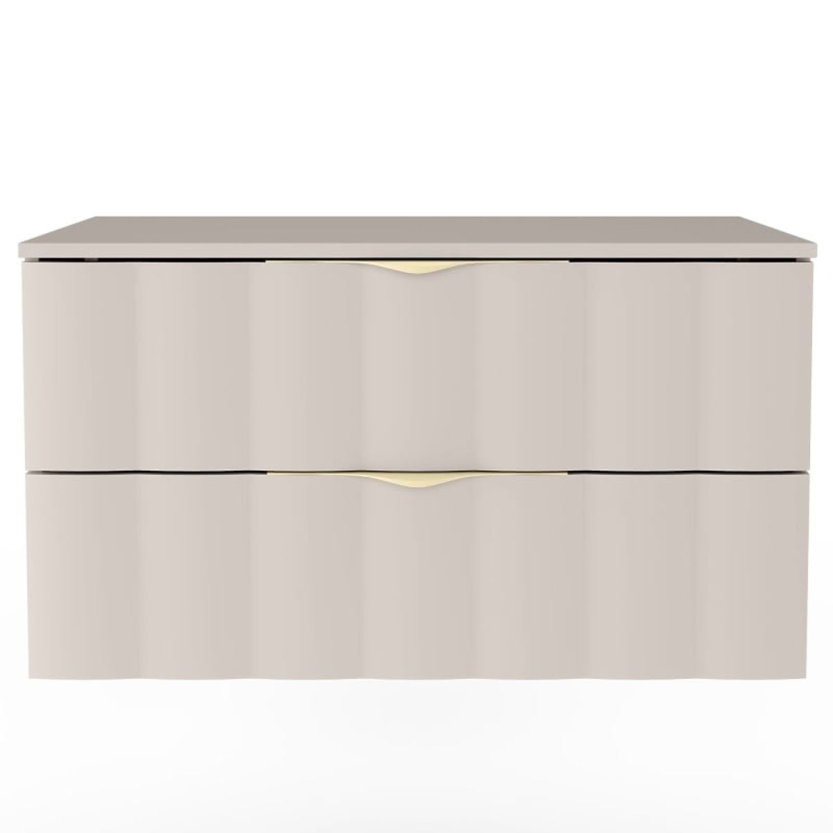 Îmbunătățiți standardul băii dumneavoastră cu dulapul Omi în nuanță de cașmir, având un design elegant și un panou frontal ondulat. Două sertare spațioase cu închidere silențioasă și mânere de culoarea aurului periat asigură o organizare perfectă.