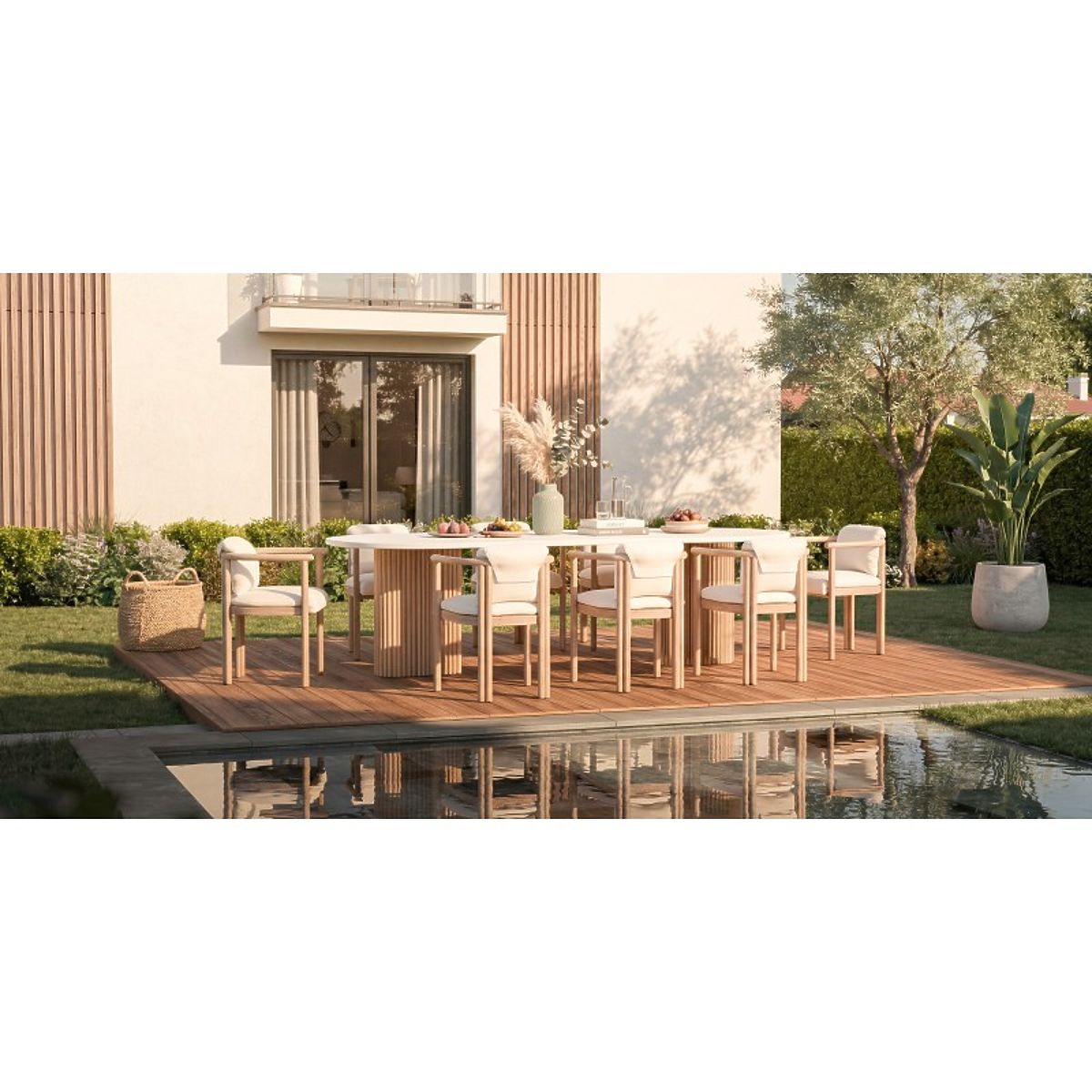 Masa Komorebi este o combinație de design modern și funcționalitate. Blatul de piatră și picioarele din lemn decorate cu lamele creează un contrast stilat, care va înviora orice spațiu de grădină. Este locul ideal pentru cafea sau prânz într-un stil elegant, dar natural.