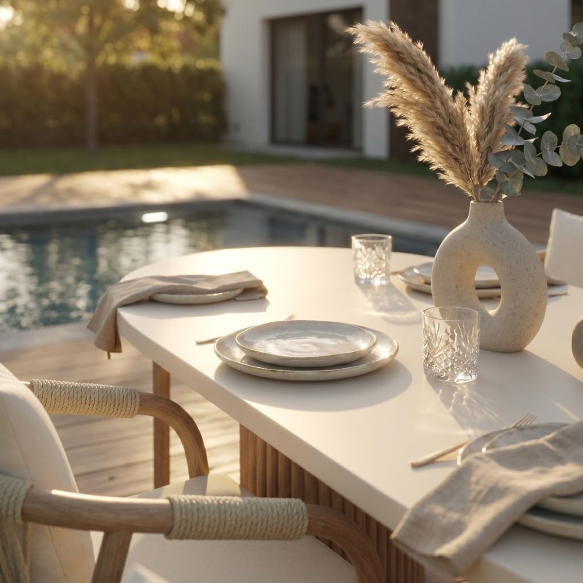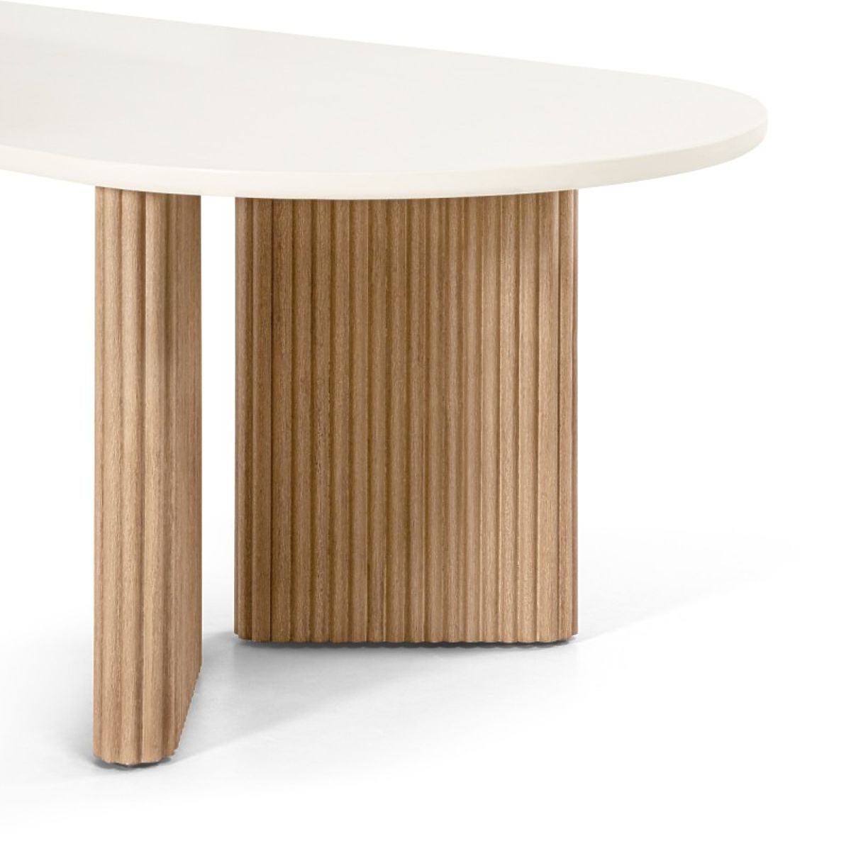 Masă de grădină ovală Komorebi cu blat de piatră și picioare din lemn de salcâm. .. mai mult