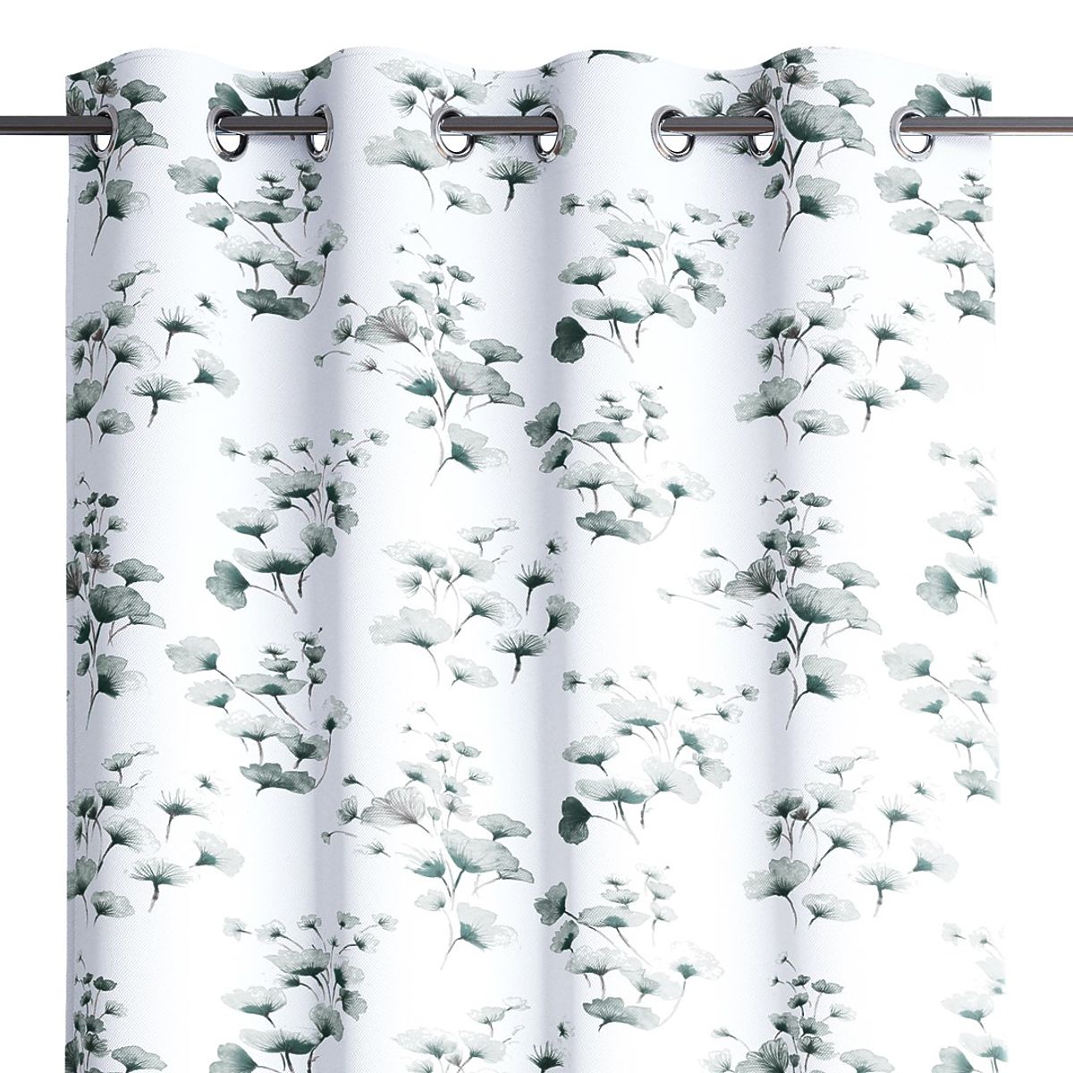 Draperie albă cu motiv vegetal imprimat și inele metalice argintii. .. mai mult