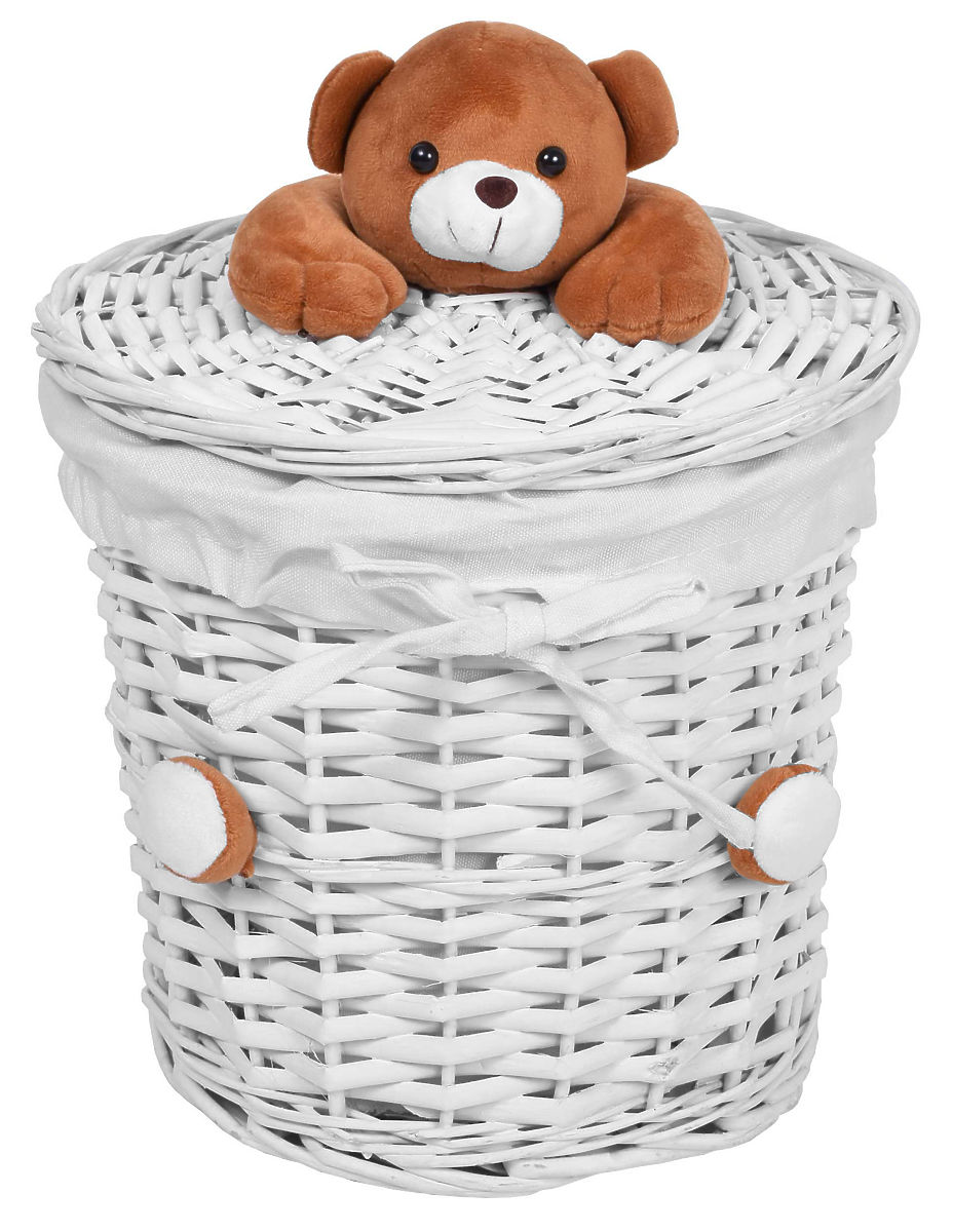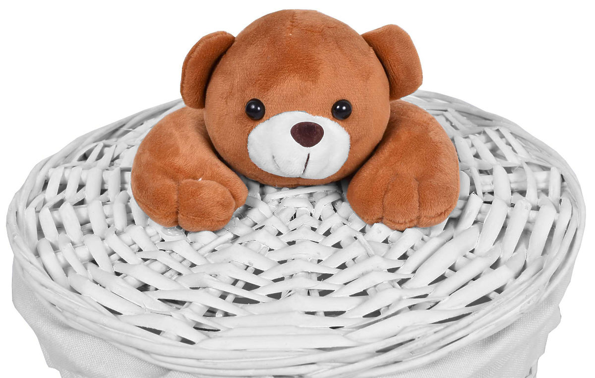 Produsul este realizat din răchită cu împletitură uniformă, iar interiorul este căptușit cu un material rezistent, de culoare crem, din in. Capacului îi este atașat un ursuleț de pluș, plăcut la atingere.
